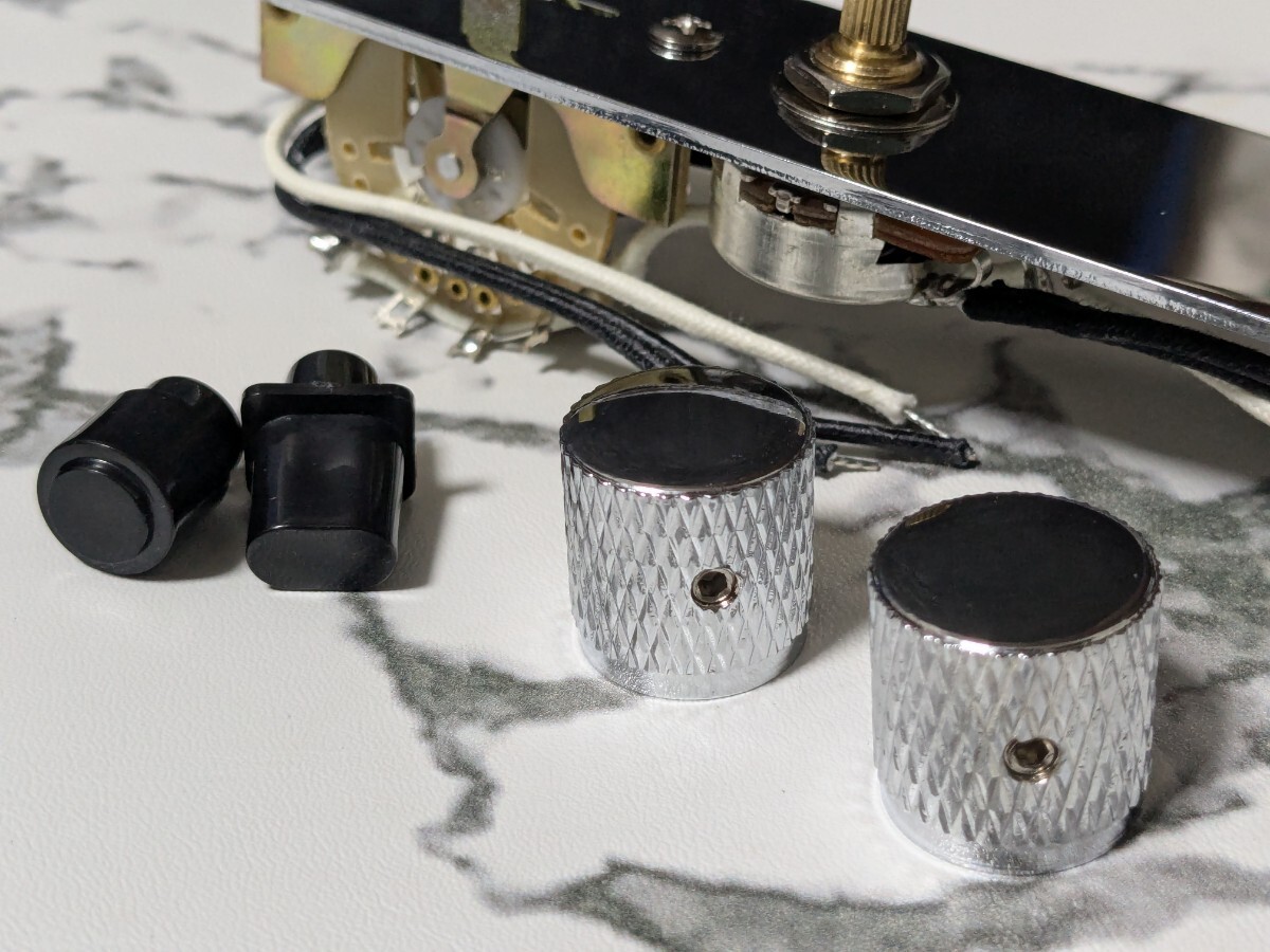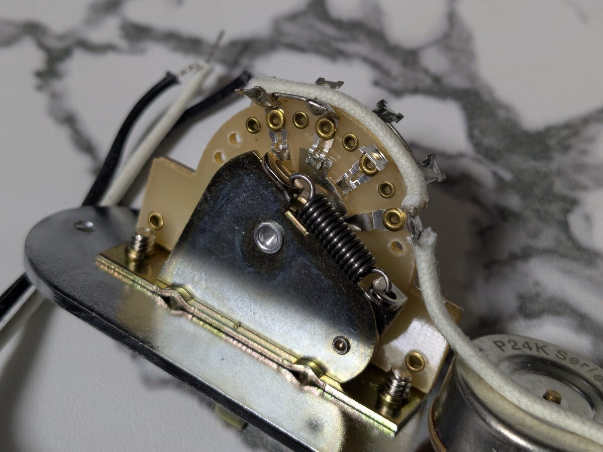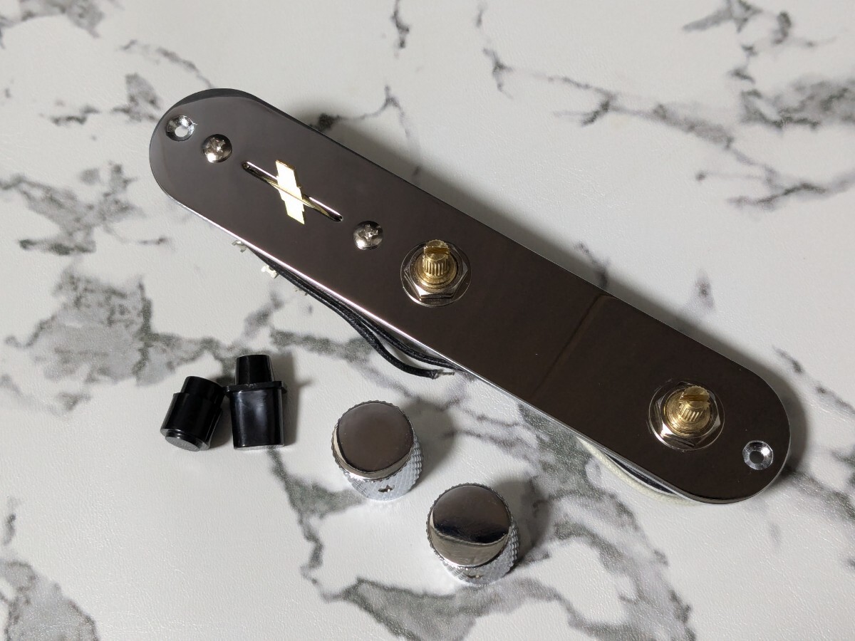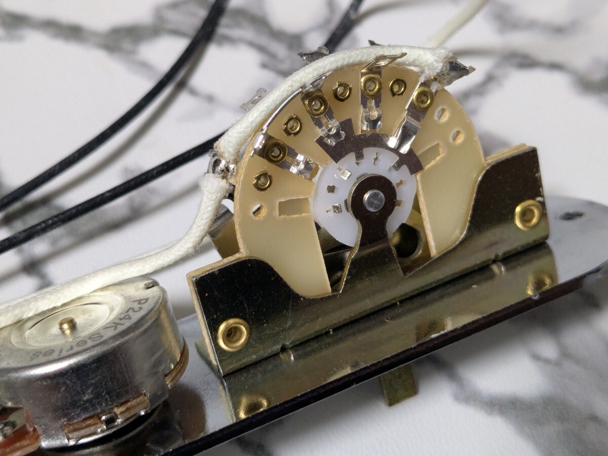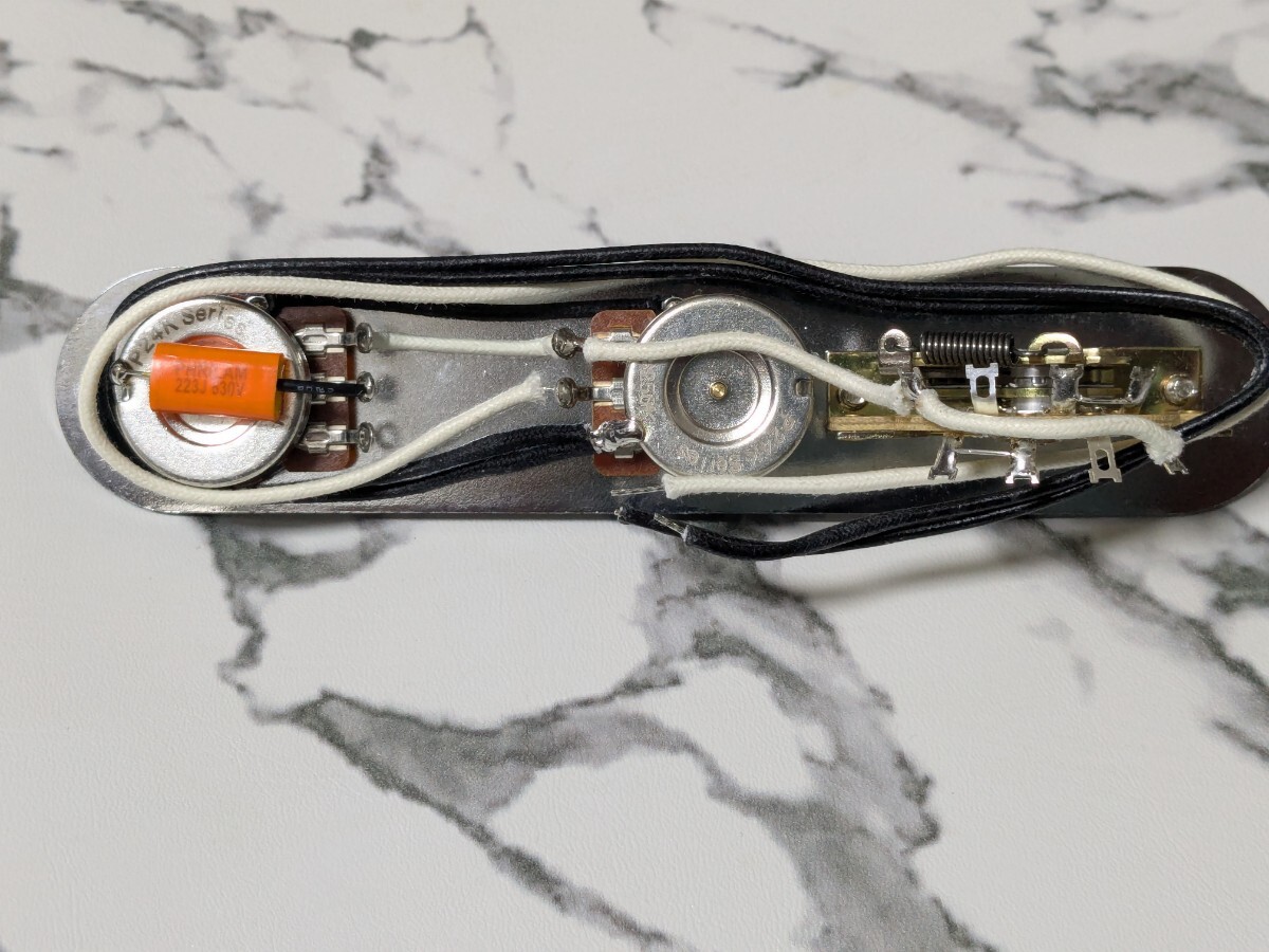 0.022μf630Vオレンジコンデンサー、250kΩブラスシャフトポッド、クロスワイヤー、高耐久のオープンスイッチが使用されてありグレードアップにおすすめです。