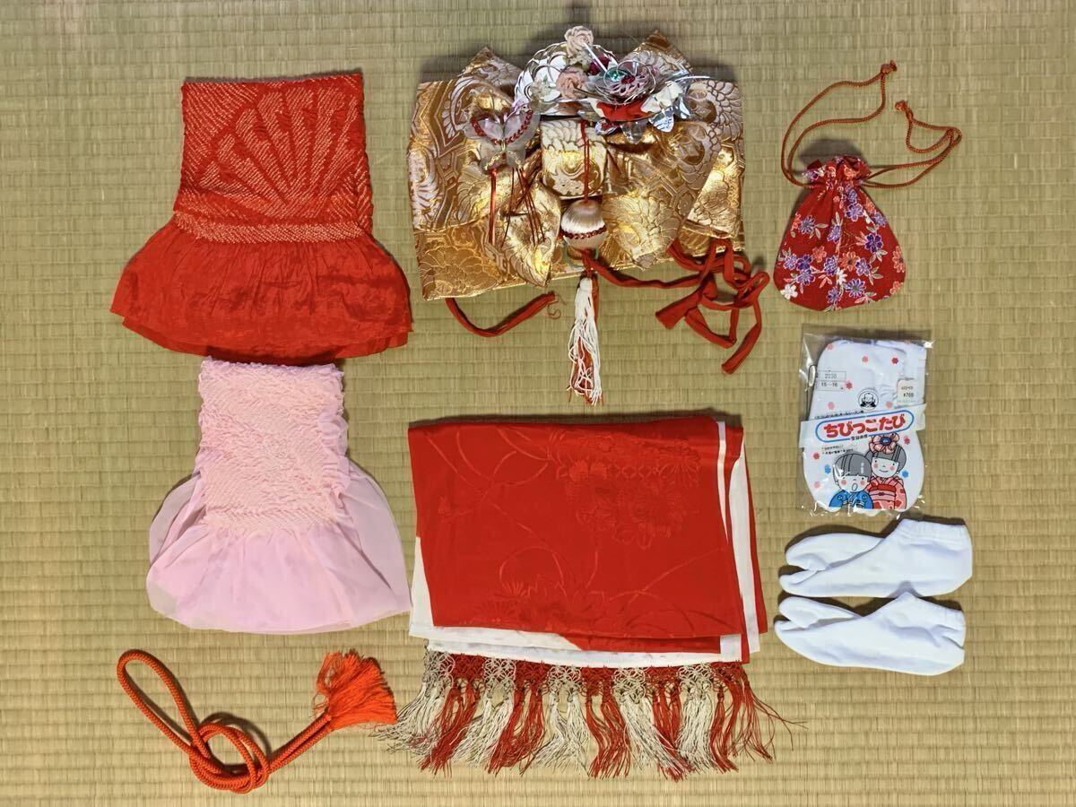 60年ほど前の古い女児の帯他セットです。長期保管品のため、シミ、汚れ、毛玉、ほつれ等見られますので古いものを気にされる方はご遠慮下さい。