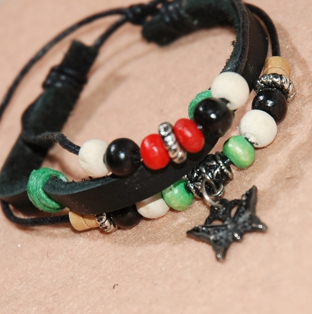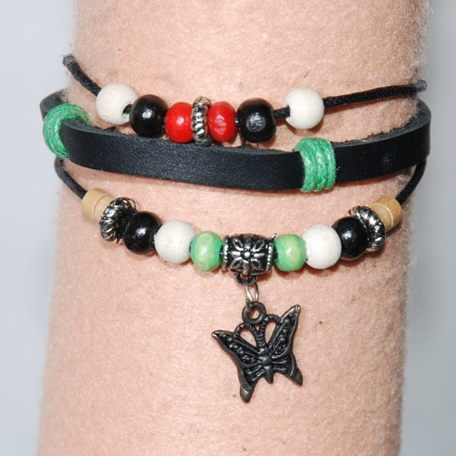 合皮と紐、ビーズ、蝶のチャームでデザインされた、3連ブレスレットです☆