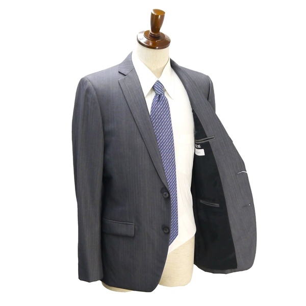 ・春秋対応。2つボタンシングル。背抜き。センターベント。フラップポケット(仕付け糸付き)。ネーム刺繍あり。開き見せ。