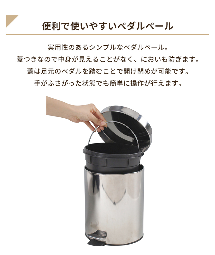 | ゴミ箱 5L ペダルペール フタ付き ステンレス製 ごみ箱 幅25cm ラウンド型 円形 ダストボックス ペダル式 分別 足踏み くずかご くず入れ 分別ゴミ箱 ごみばこ ペール ペダル開閉式 丸型 缶 ペール缶 スタイリッシュ 12リットル 蓋付き 臭い漏れ防止 リビング ダイニング キッチン 洗面所 |