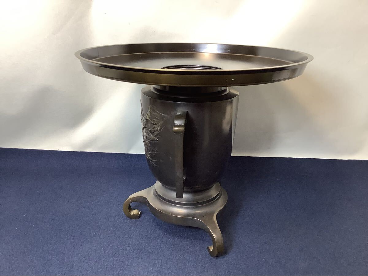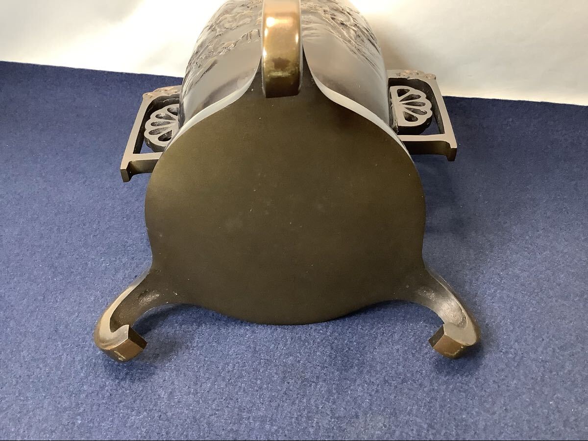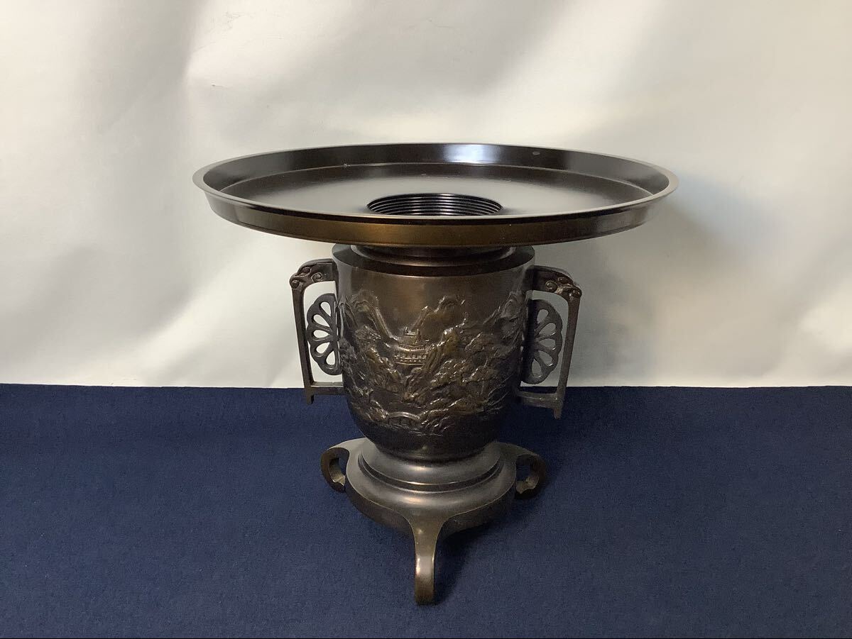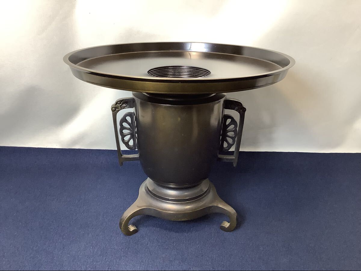 商品名:伝統工芸 鋳銅薄端 三足 花器 菊耳透し 花入 花瓶 華道具 茶道具 金属工芸 銅花器 銅器 骨董 現状品 HI092601