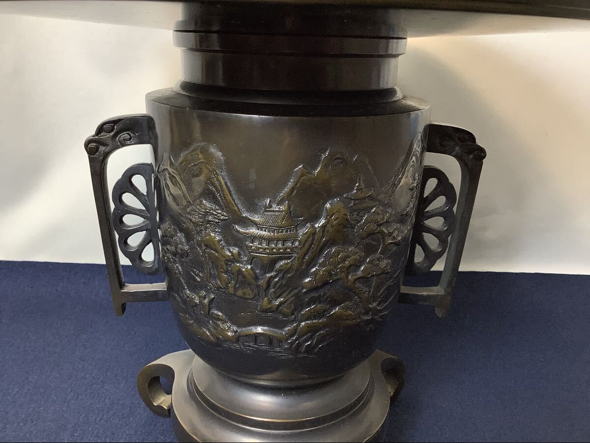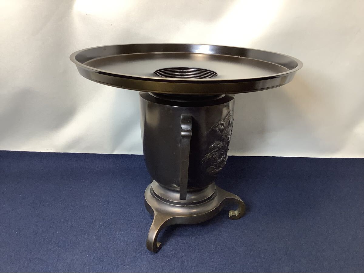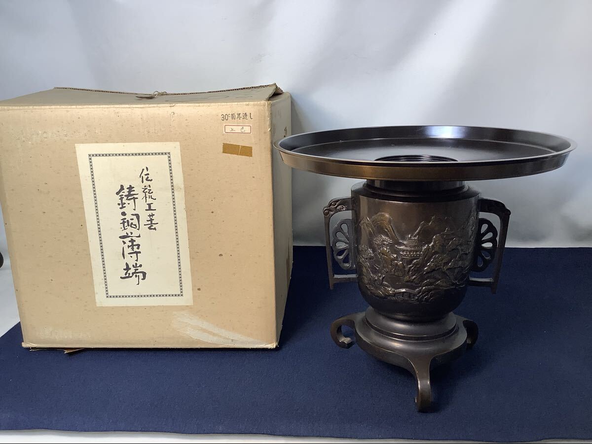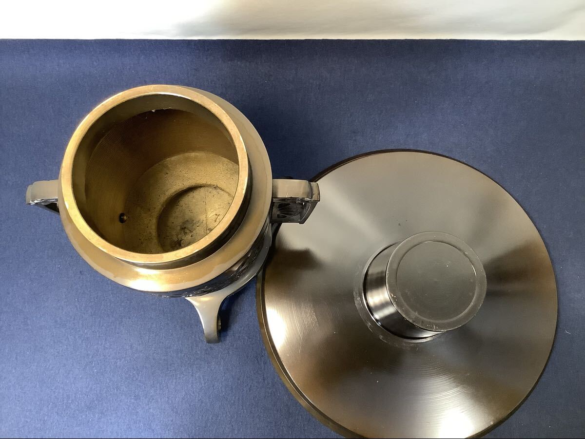 商品名:伝統工芸 鋳銅薄端 三足 花器 菊耳透し 花入 花瓶 華道具 茶道具 金属工芸 銅花器 銅器 骨董 現状品 HI092601