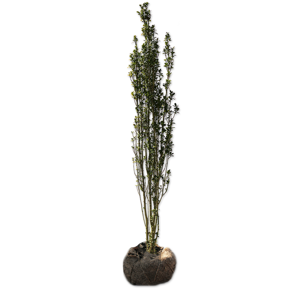 スカイペンシルはモチノキ科のイヌツゲの仲間です。枝がすべて上を向いて伸びますので樹形が引き締まっています。葉はイヌツゲと同じ小さく光沢がある葉です。一年中葉が落ちません。あまり伸びず、枝が暴れたりしませんので剪定の必要がありません。非常に手間が掛からない品種です。初夏に小さい白い花を咲かせ黒い小さい実がなります。日陰にもよく耐えますので植える場所を選びません。