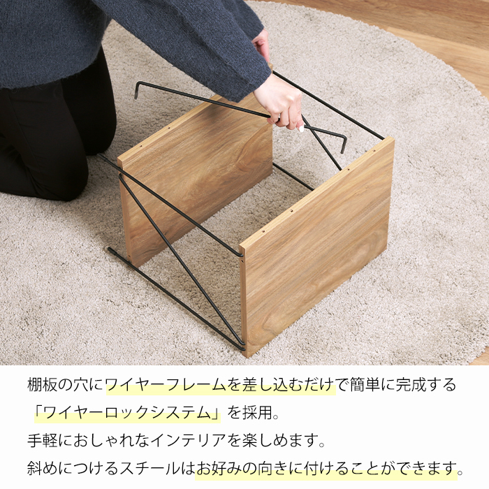 棚板の穴にワイヤーフレームを差し込むだけの簡単組み立て。