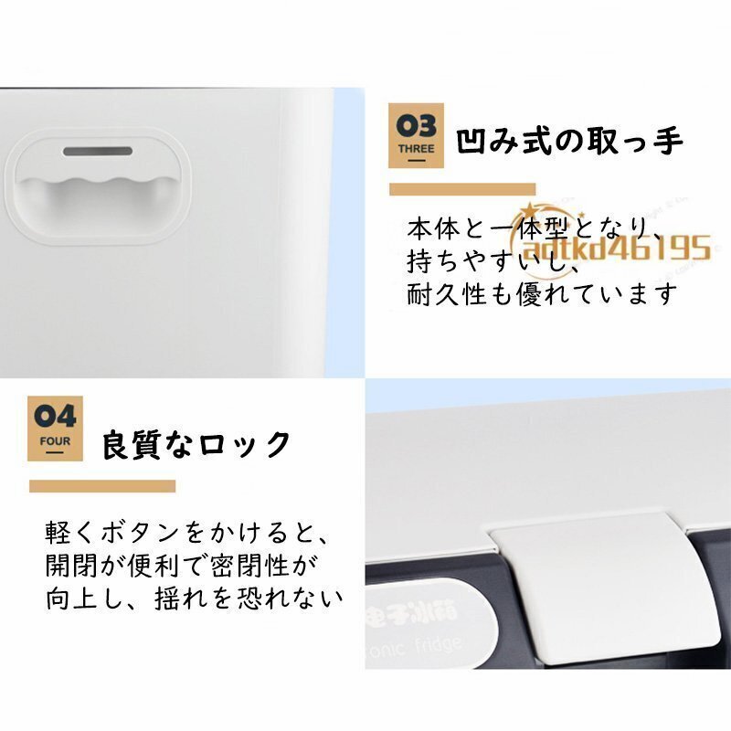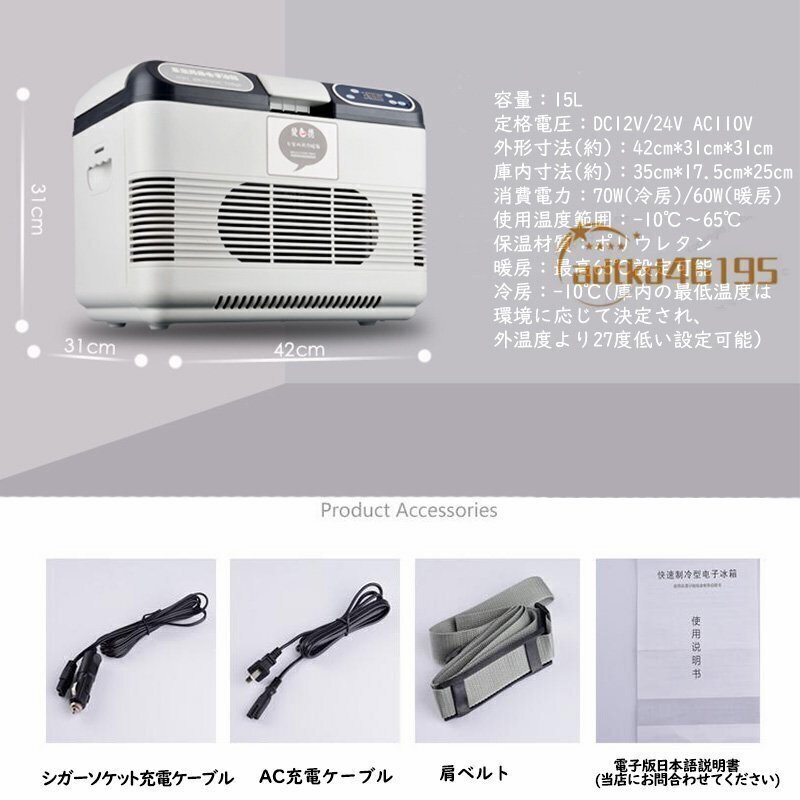 カラー:白&灰色本体重量(約):6kg庫内寸法(約):350*175*250mm外形寸法(約):420x310x310mm電圧:DC12V・DC24V/110V材質:ABS樹脂、アルミニウム、ポリウレタン容量:15L消費電力:60-70W使用温度範囲:-10℃~65℃パッケージ内容:15L車載冷蔵庫本体、AC充電ケーブル、シガーソケット充電ケーブル、肩ベルト、日本語説明書。