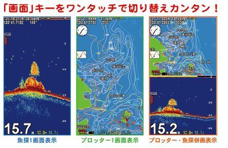 プロッター画面と魚探画面は1画面表示のほか、併画でも表示することができ、魚探画面を見ながら気になるポイントをマーク入力することができます。