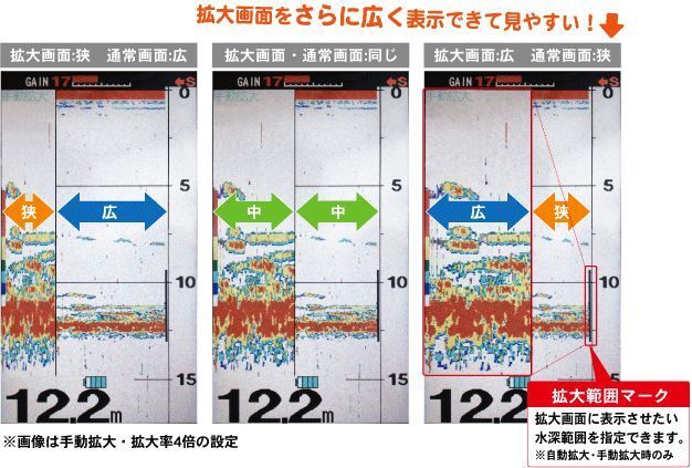 ※ワカサギモードON時には拡大倍率から拡大幅へ切り替わり、拡大幅を2m・3m・4mから選択できます。