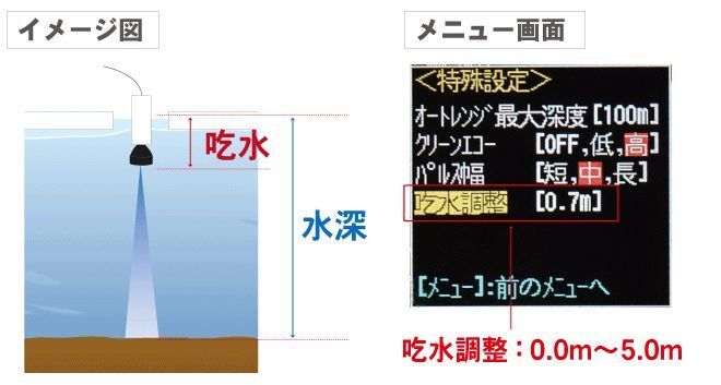 水面からの深度を表示する時に、振動子を水中に沈めた深さ(吃水)を設定することで、正確な水深を表示することができます。