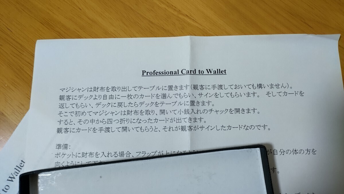 オールイタリアンレザーのウォレットは、日常使いにも最適なウォレットです。サインされたカードがデックに戻され客にもシャッフルさせます。演者は演技前からテーブルに置いてあった財布を取り、ジッパーを開けて、中からサインされたカードを取り出します。