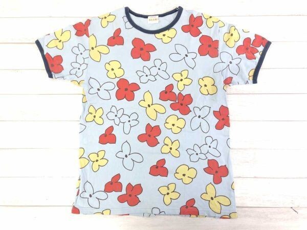 オールド ビームス OLD BEAMS レトロ 00s アメカジ サーフ ヒッピー 古着 イラスト 花柄 総柄 リンガー トリム 半袖Tシャツ メンズ 水色 です。
