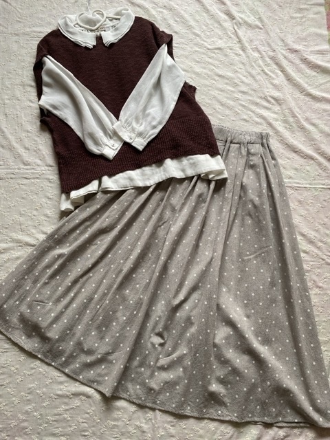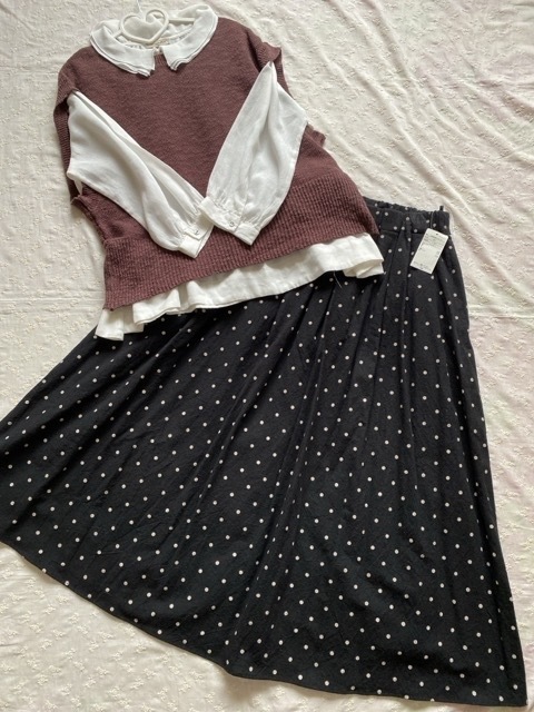 ドット柄スカートグレー、ブラック、ダブルガーゼ重ね衿ブラウスオフは別出品しております。