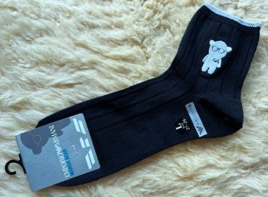 ●黒色地のリブ編みに遊び心いっぱいの楽しいマンガ風ベアが白色刺繍でデザインされたソックスです