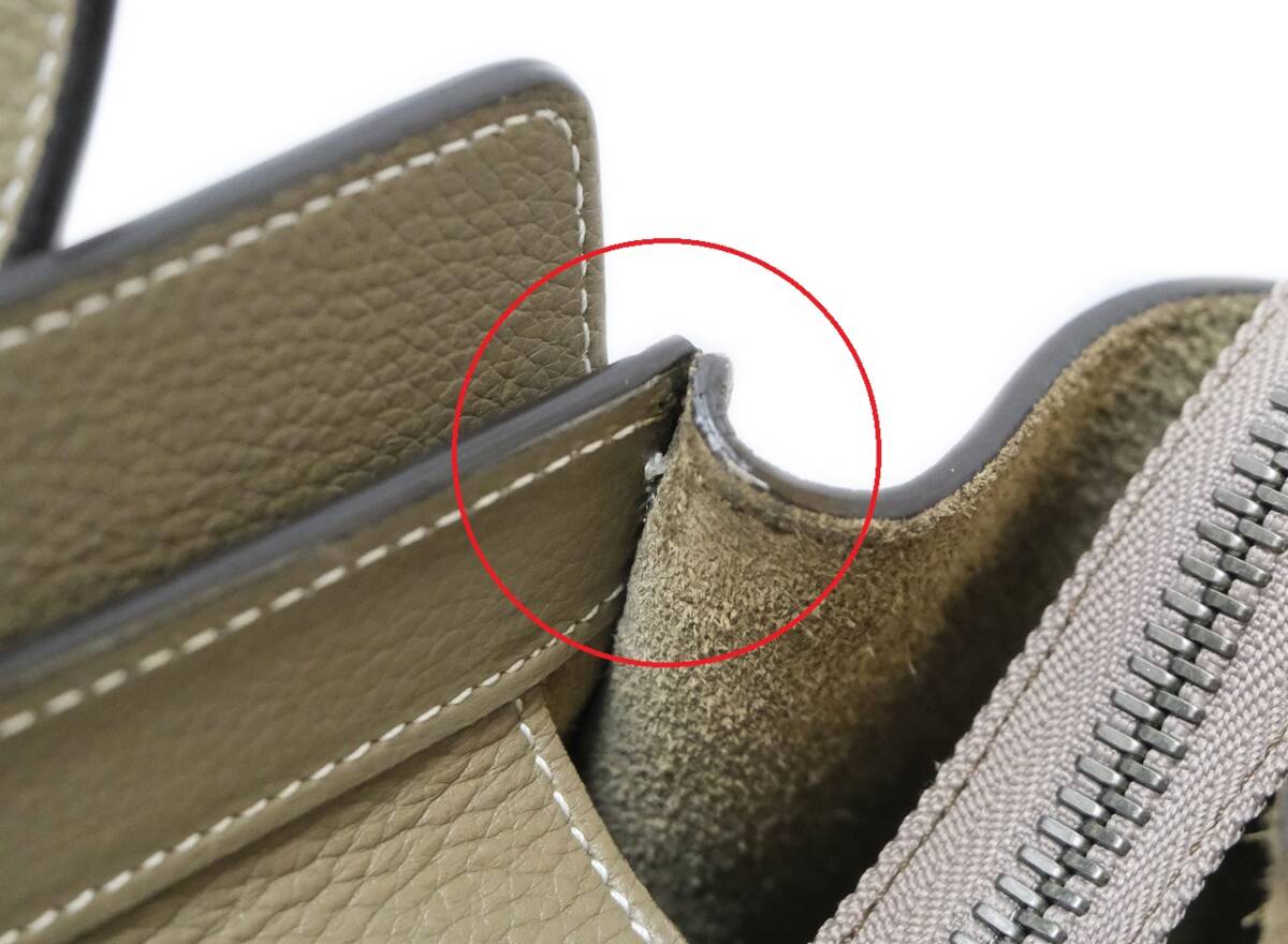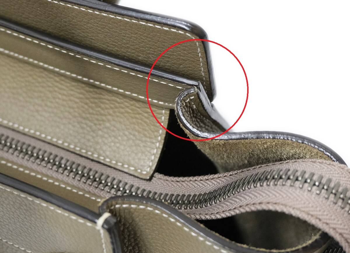 サイド上部ダメージ(糸ツレ)、ハンドル内側に汚れあり。