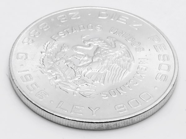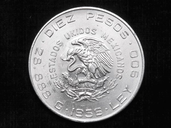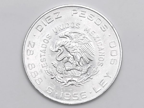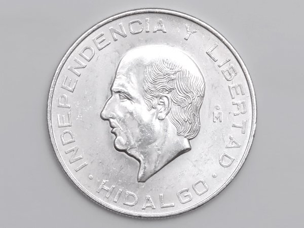 ■ メキシコ 10ペソ 銀貨 ミゲル・イダルゴの横顔 1956年発行 ■ 片面にはメキシコ独立の父と呼ばれるミゲル・イダルゴ司祭の横顔が描かれています ■ 片面にはメキシコの国章である蛇を咥えた鷲やサボテンが描かれています ■ 肖像の周囲に「INDEPENDENCIA Y LIBERTAD(独立と自由)」「HIDALGO」の文字があります ■ 国章の周囲に「ESTADOS UNIDOS MEXICANOS」「DIEZ PESOS」「LEY 900」「28.888 G」「1956」の文字があります ■ 品位:Ag .900(銀 90%) |