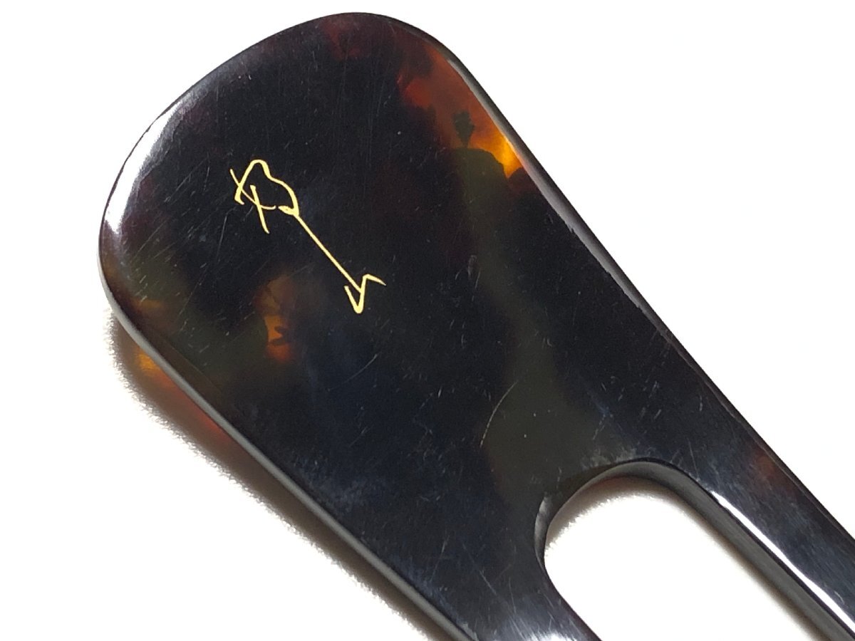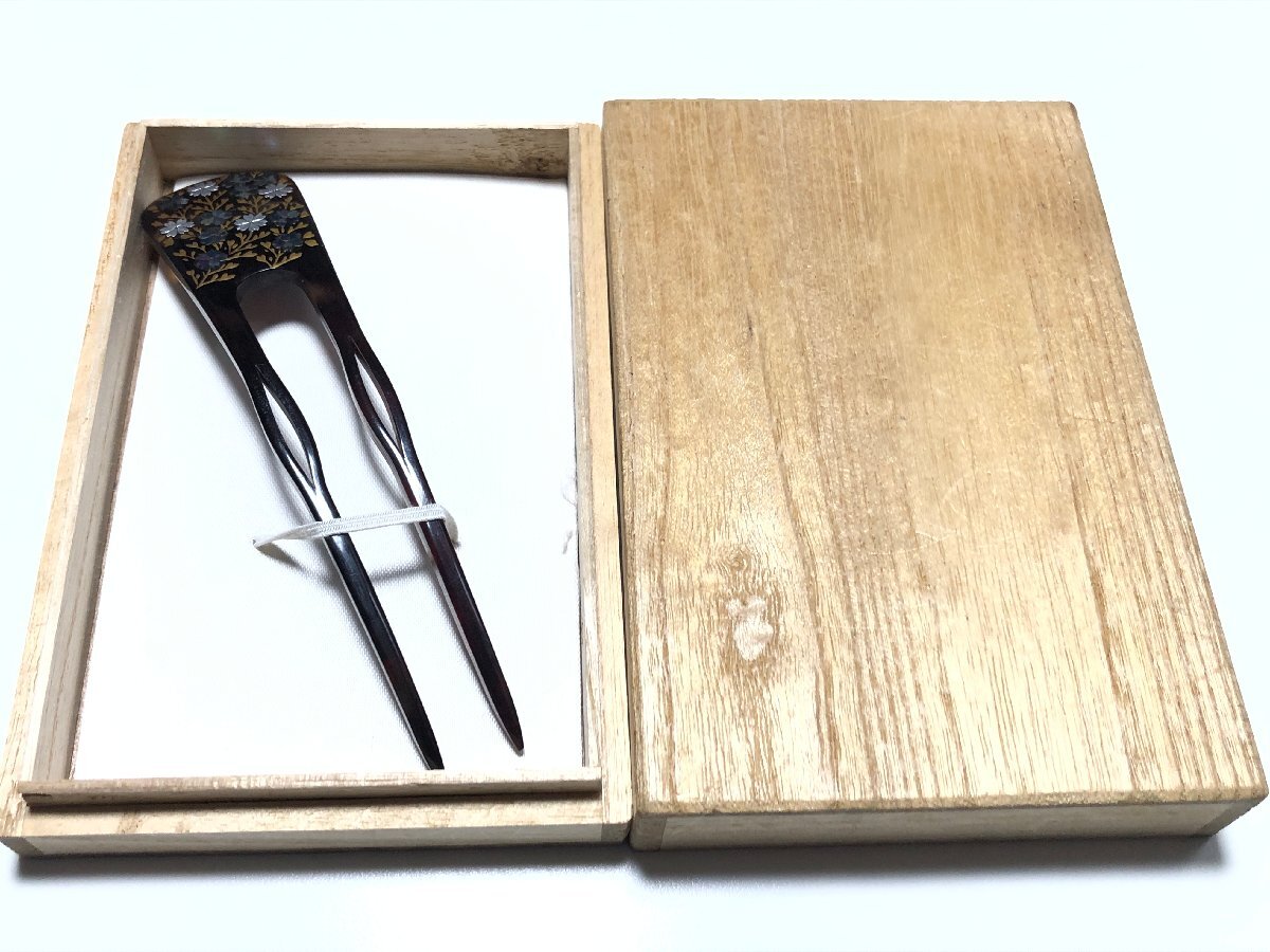 アンティークの本鼈甲を使用し、金蒔絵、螺鈿を施した、桜文の簪です。作者、好山の銘があります。鼈甲部分に欠けや虫食いはありません。共箱付属です。