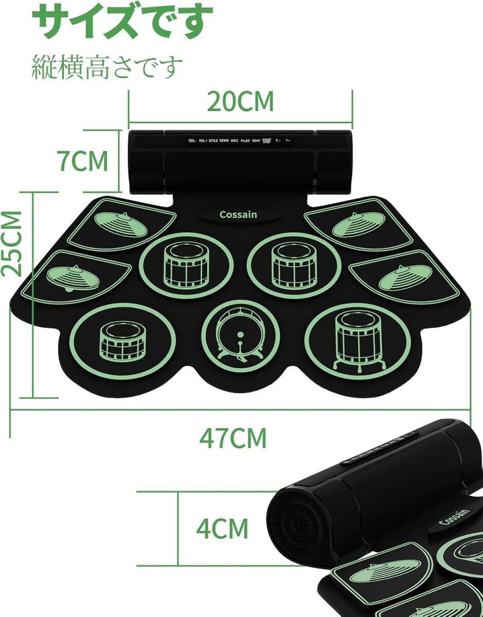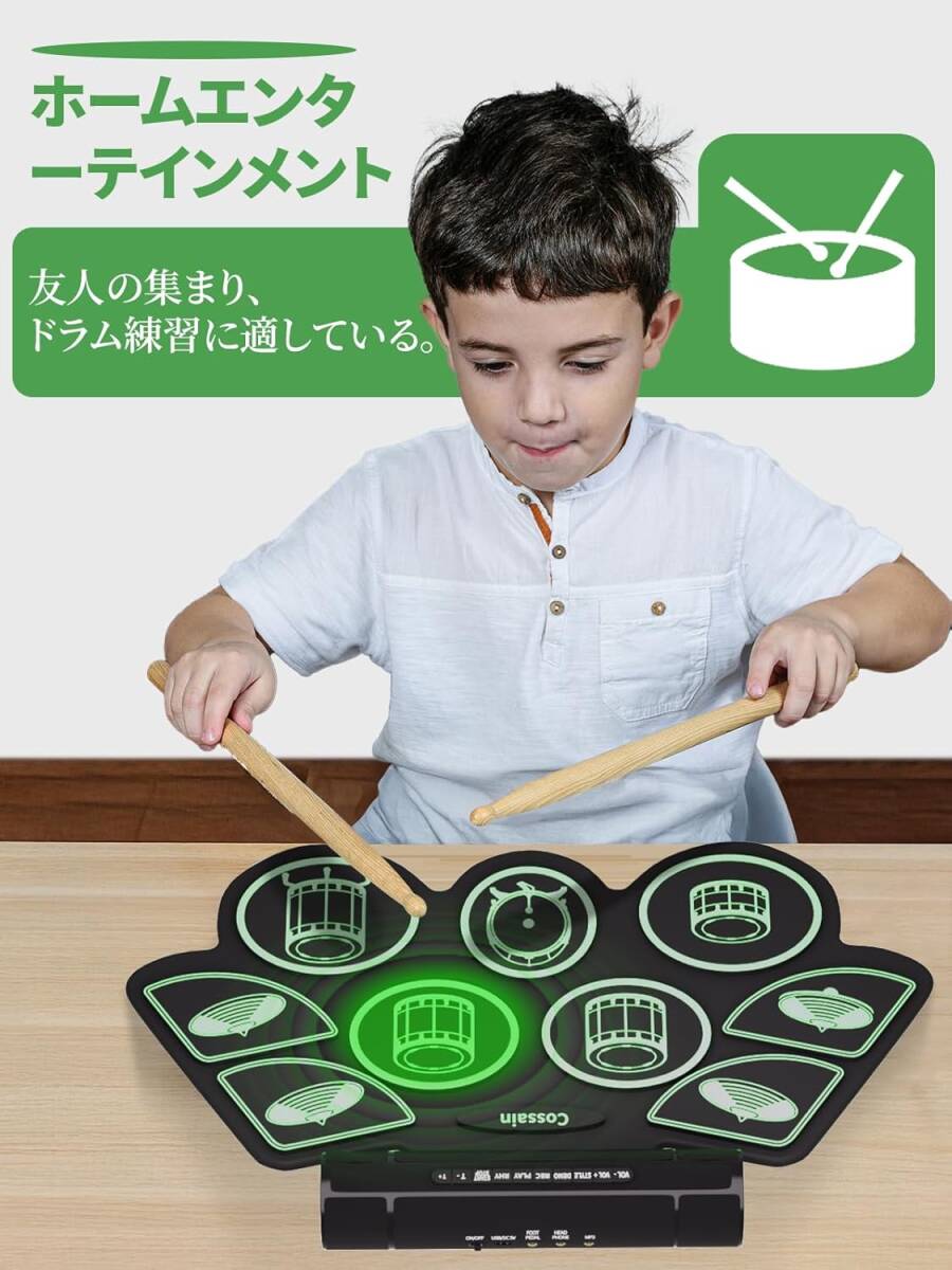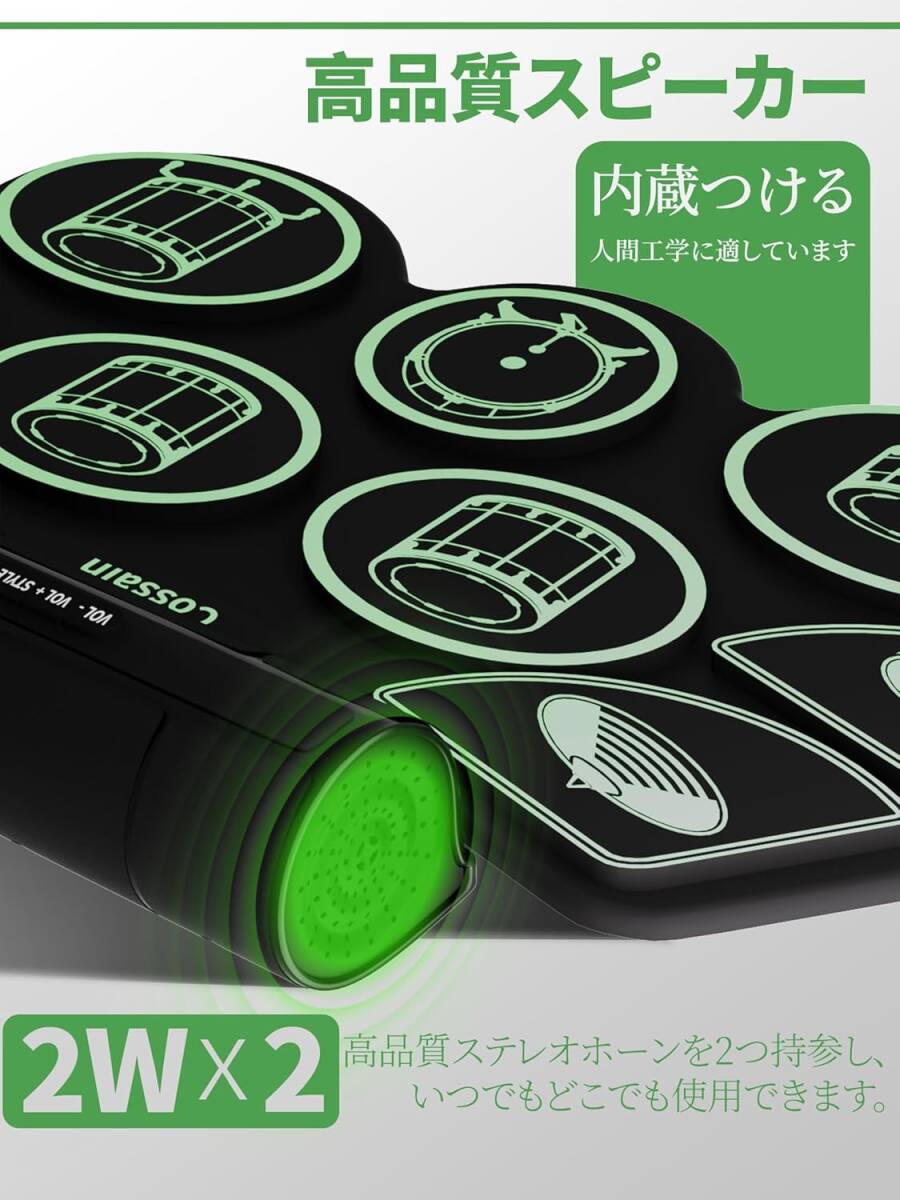 グリーン色 電子ドラム 折りたたみ 小さく畳める ロール 子供向け 初心者向け セット 持ち運び 9パッド ハイハット付き