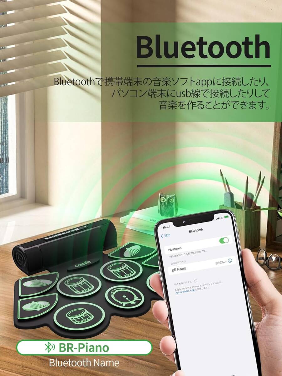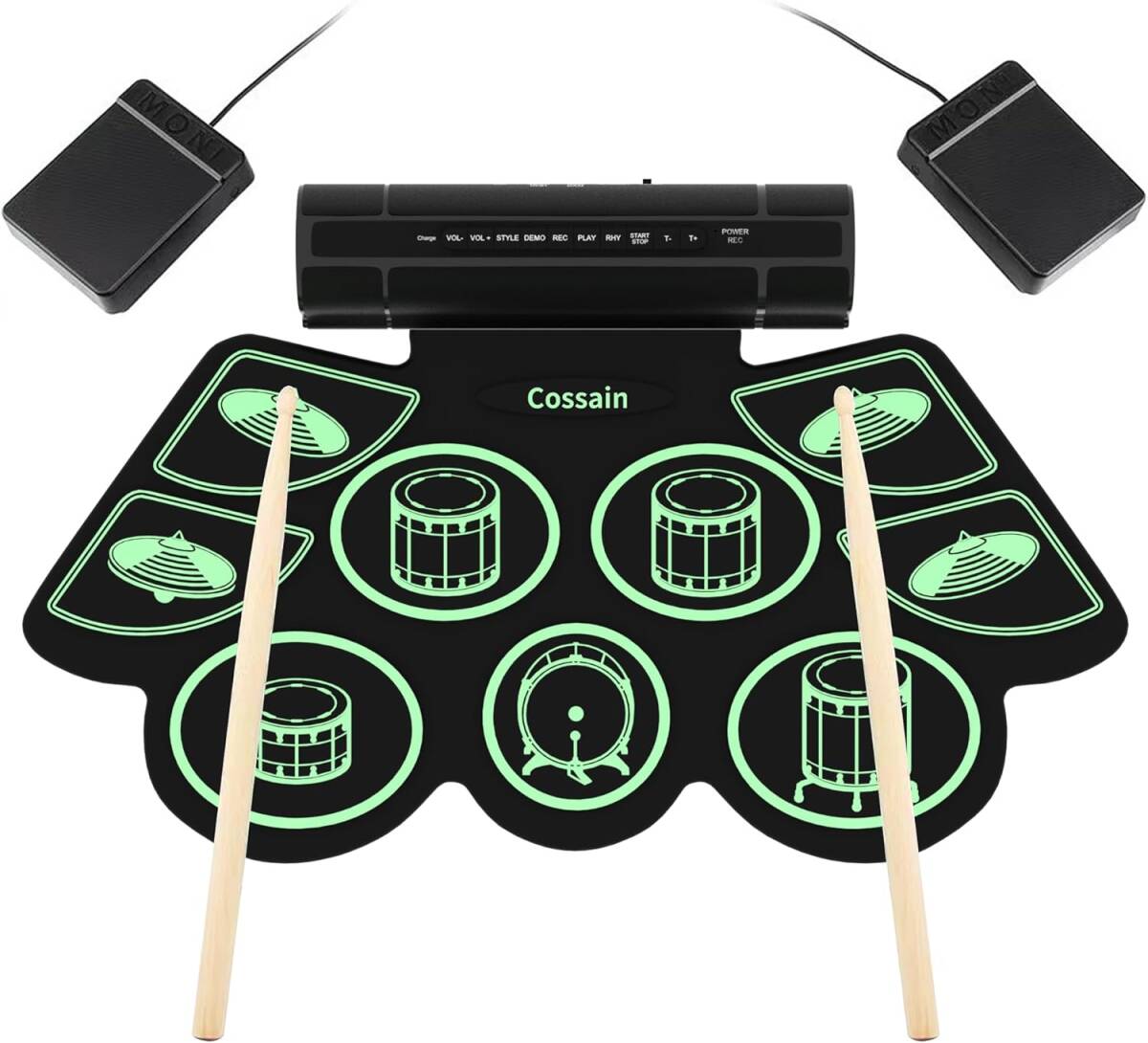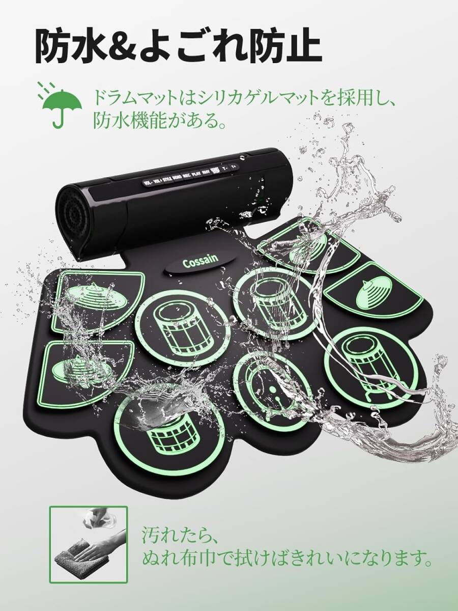 グリーン色 電子ドラム 折りたたみ 小さく畳める ロール 子供向け 初心者向け セット 持ち運び 9パッド ハイハット付き