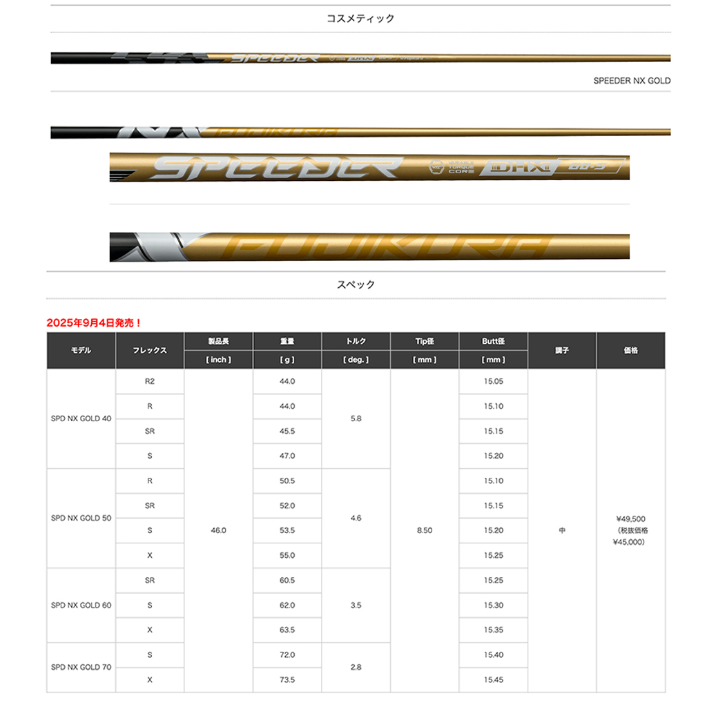 ・フジクラ スピーダの最新モデルNX ゴールドのテーラーメイド ドライバー対応スリーブ付きカーボンシャフト