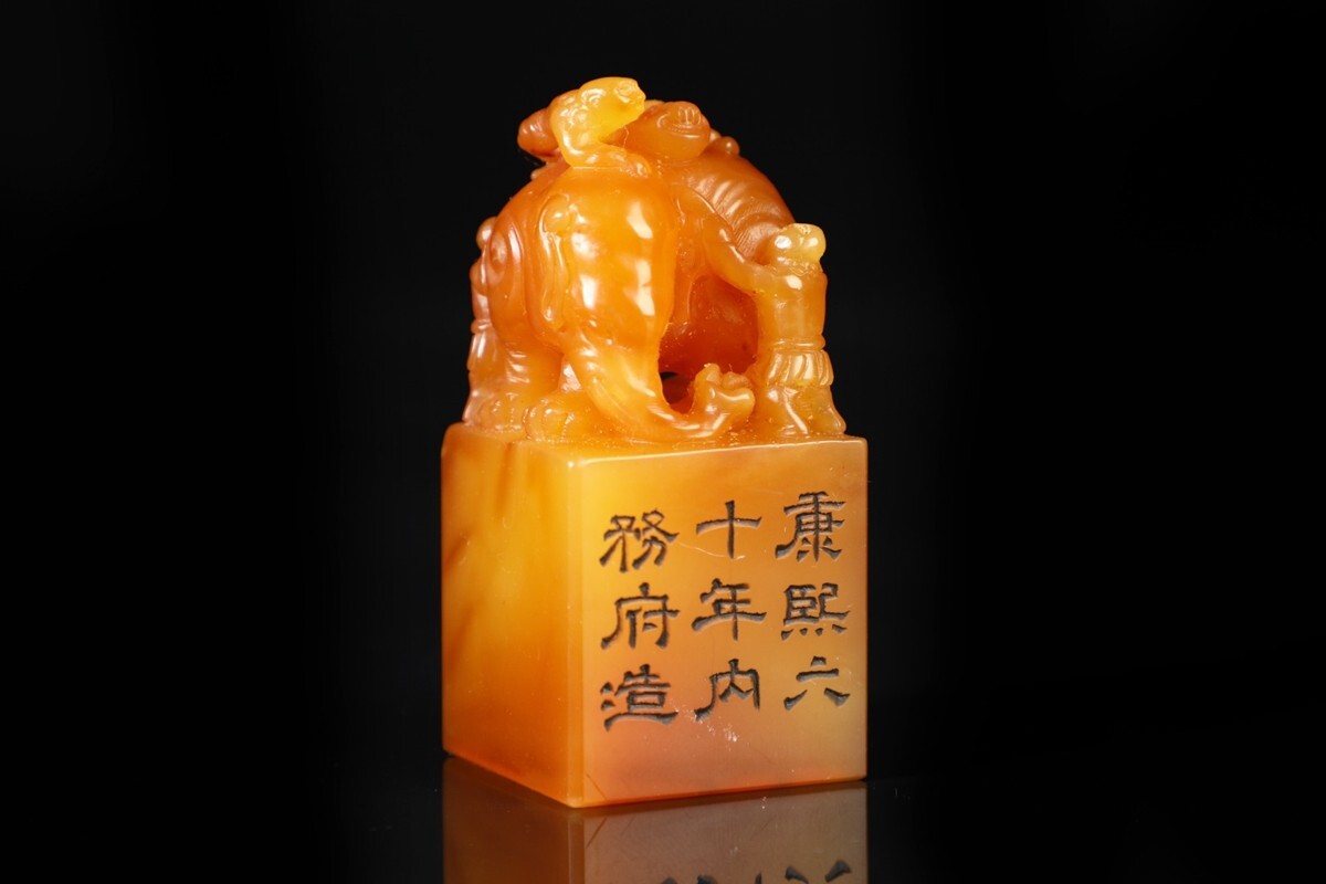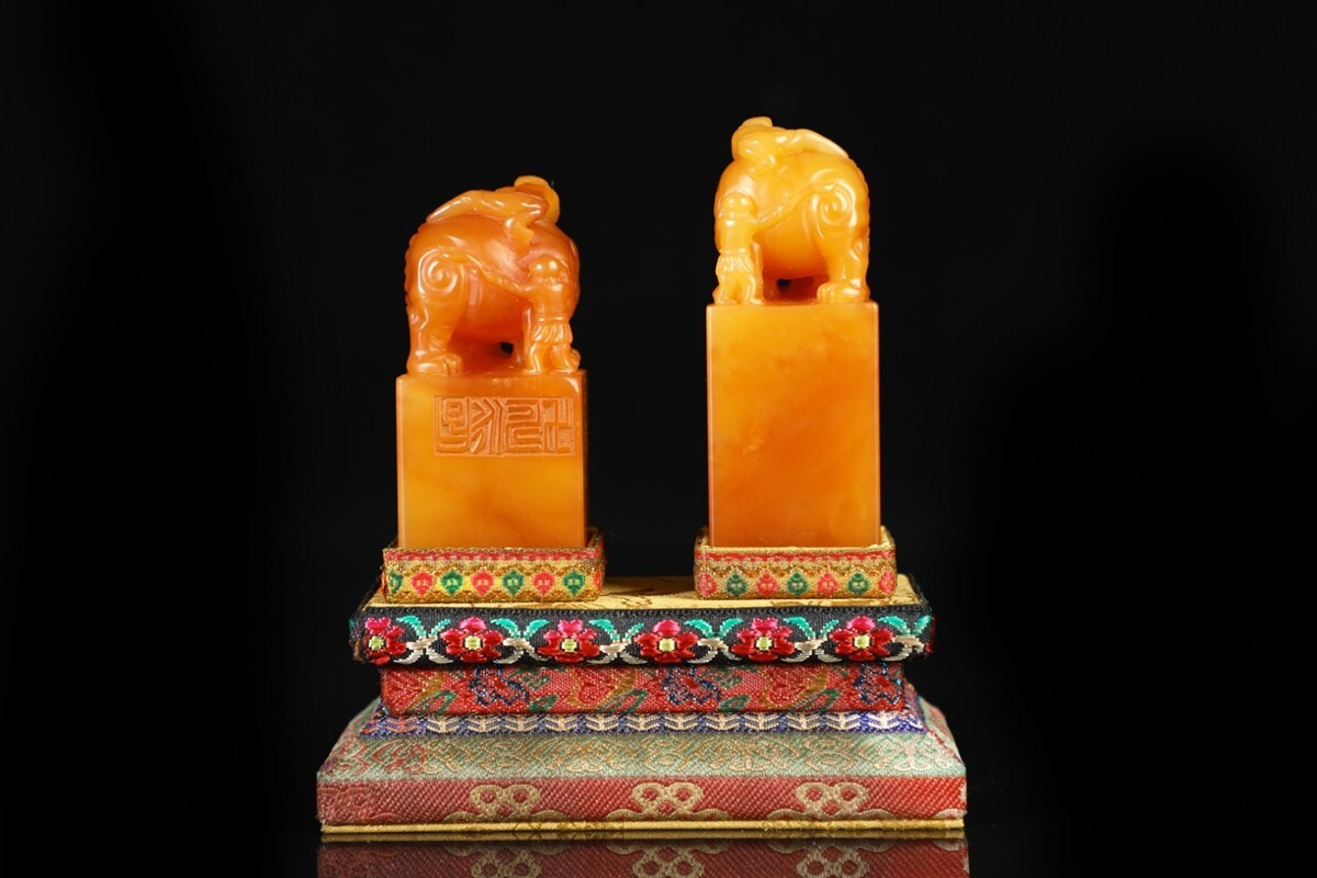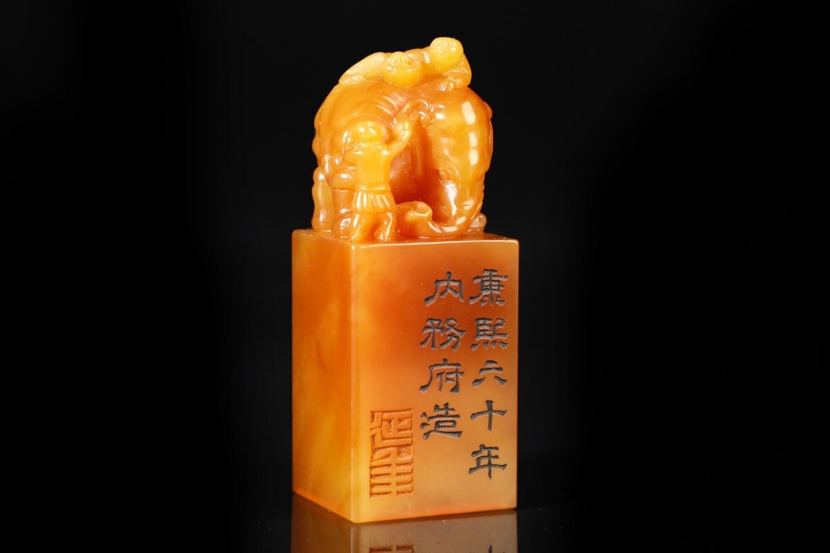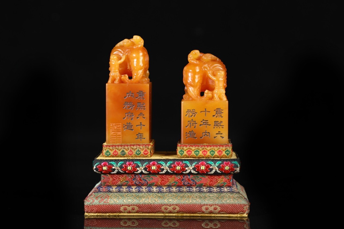 【瓏】寿山石 田黄石彫 童子洗象 対章 清代 康熙六十年内務府造 極細工 手彫り 置物擺件 中国古賞物 古美術 蔵出