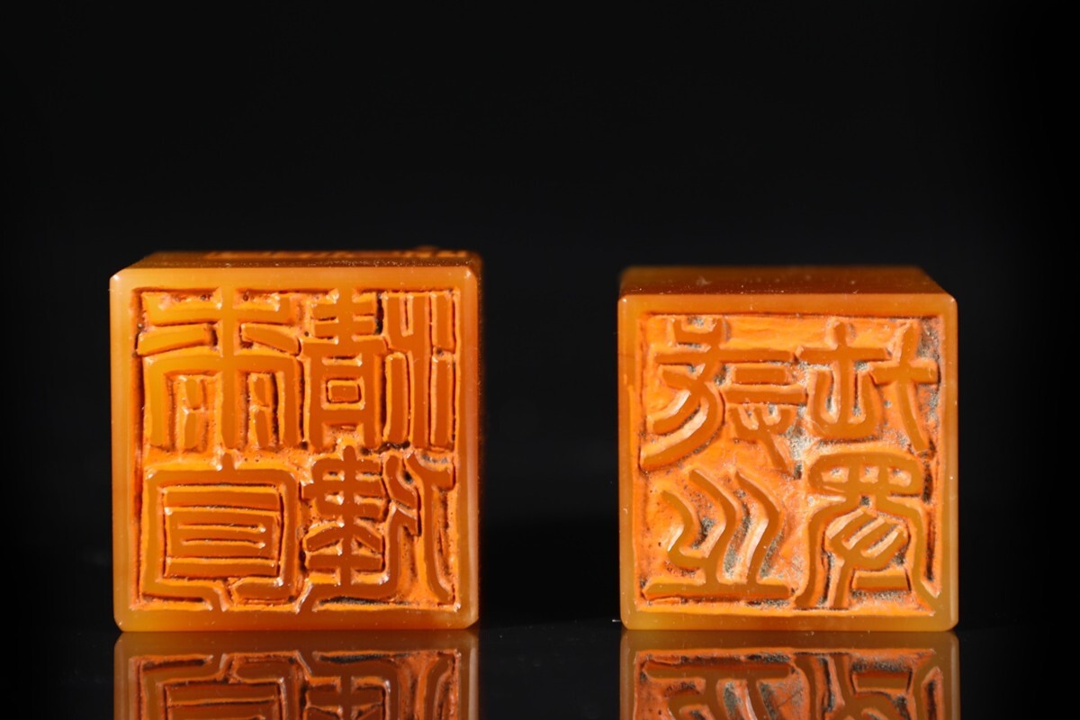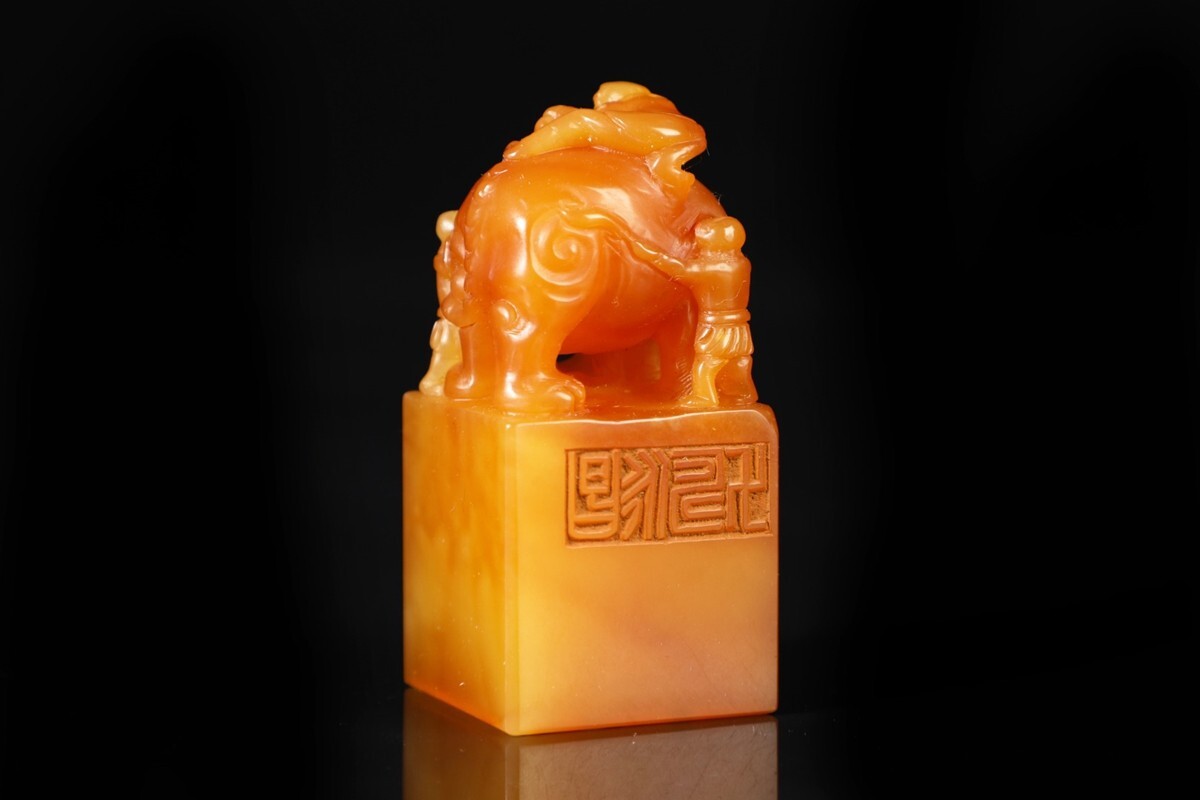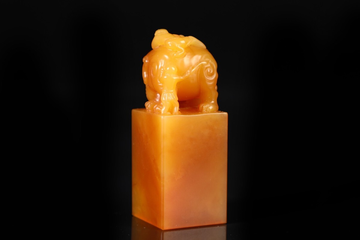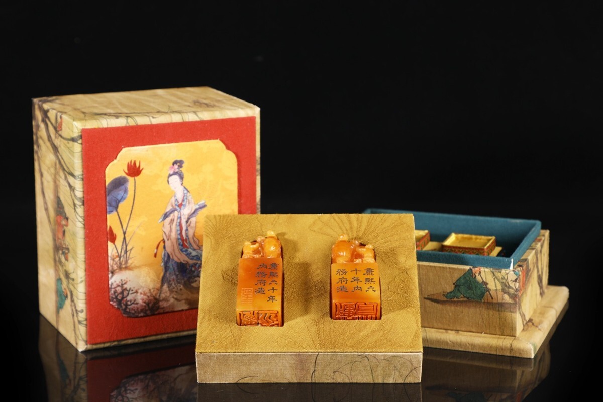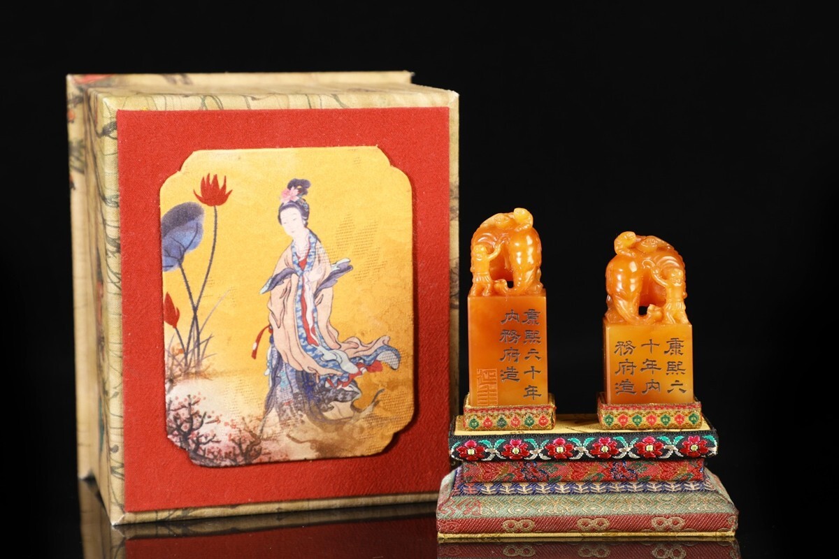 【瓏】寿山石 田黄石彫 童子洗象 対章 清代 康熙六十年内務府造 極細工 手彫り 置物擺件 中国古賞物 古美術 蔵出