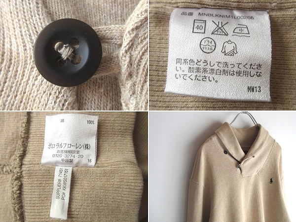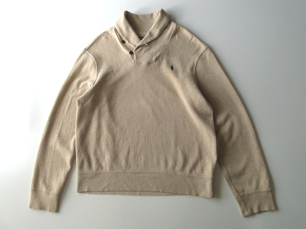 Polo by Ralph Lauren ラルフローレン ポロポニーロゴ刺繍 コットンリブ スウェットライク ショールカラー トレーナー L ベージュ