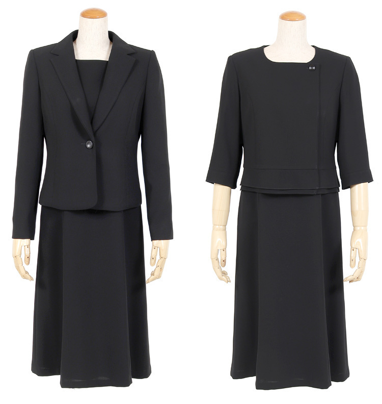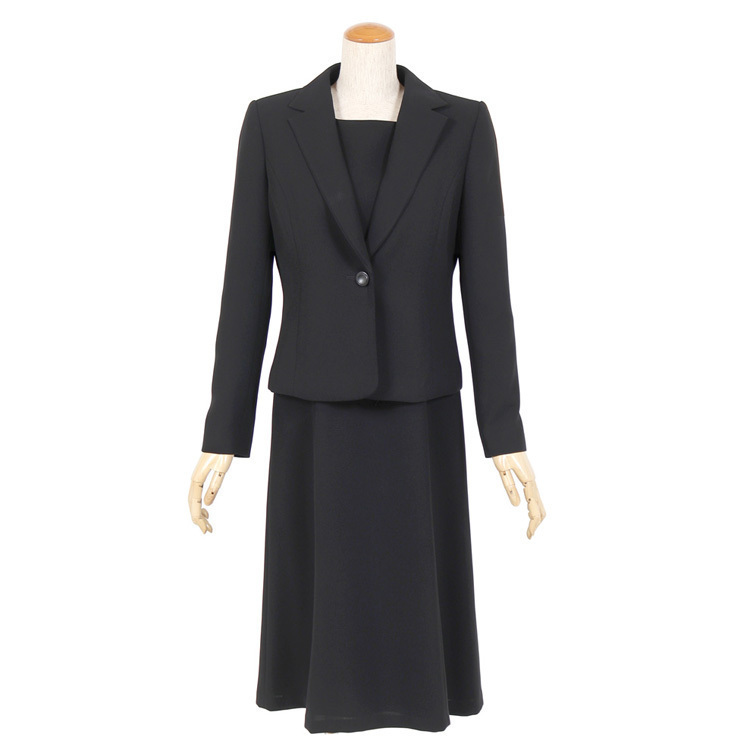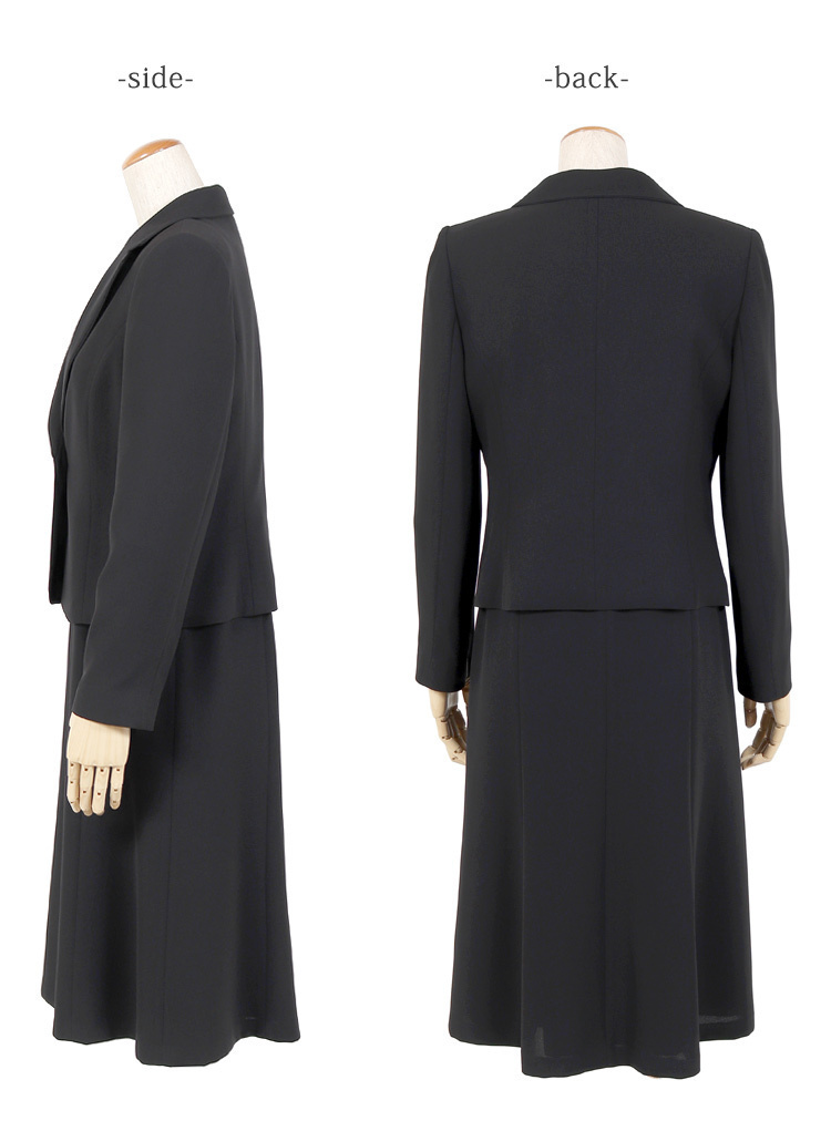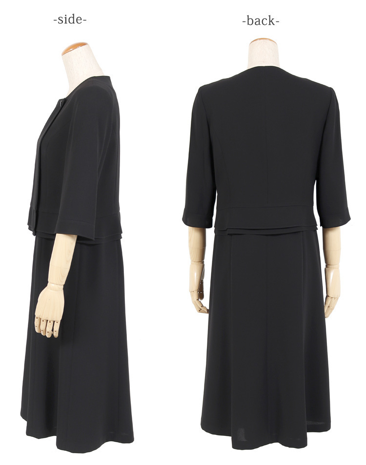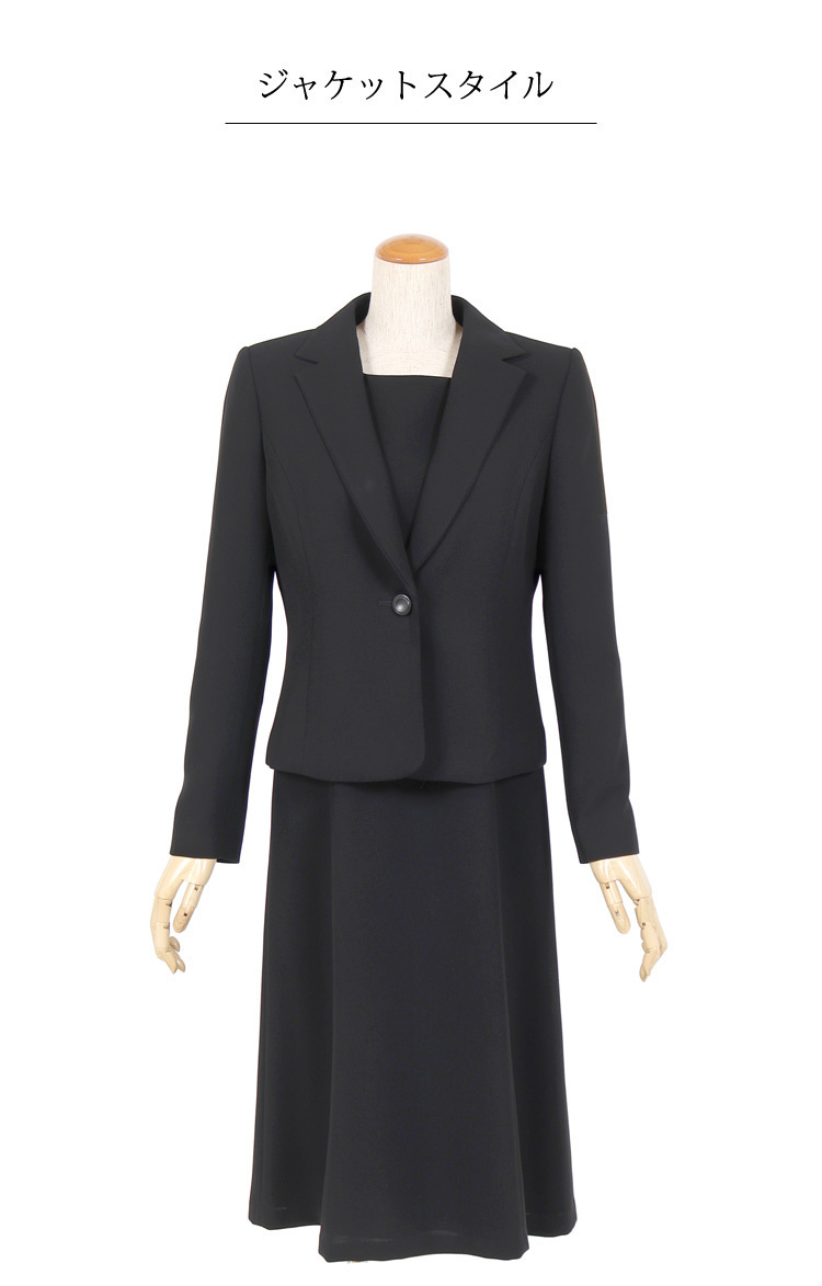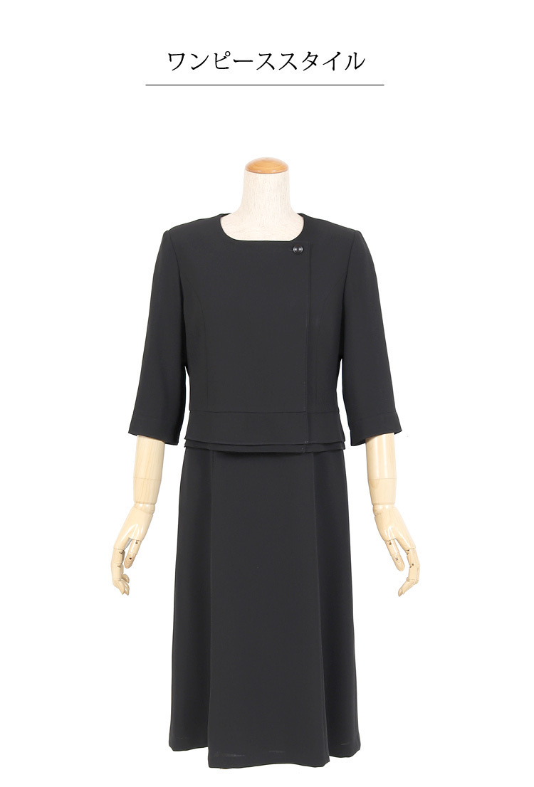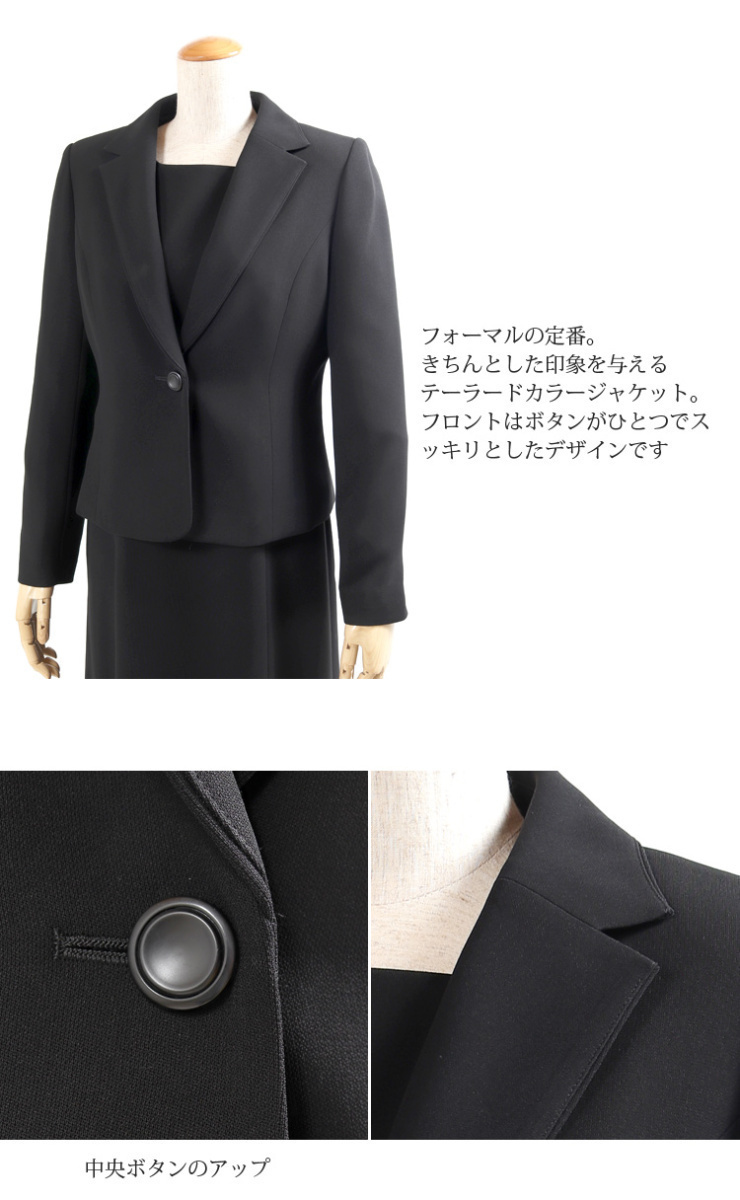 オールシーズン ブラックフォーマル15号サイズ 正統派テーラード衿のオールシーズン用ブラックフォーマルのご紹介です。 こちらは今人気の前開きタイプのフォーマルになっており、脱ぎ気が楽ちんで後ろに手が回しにくい方や授乳中のママにもおすすめです。 前開きワンピースのファスナーは見えないように工夫されたデザインとなっているのもうれしいポイントです。 こちらの商品はご自宅で洗濯が可能です。 ■商品番号 115t121-au ■セット内容 ジャケット・ワンピース ■実寸サイズ ジャケット