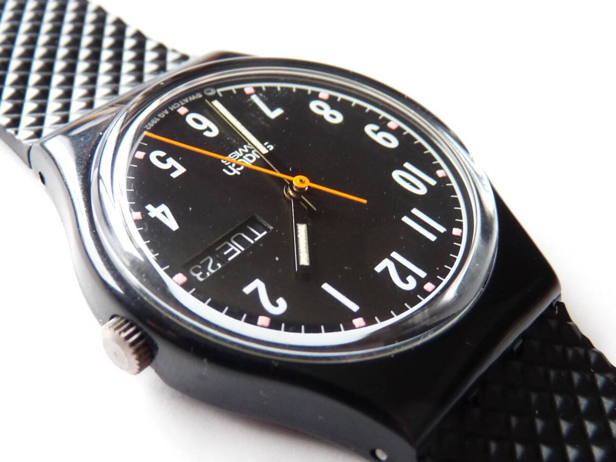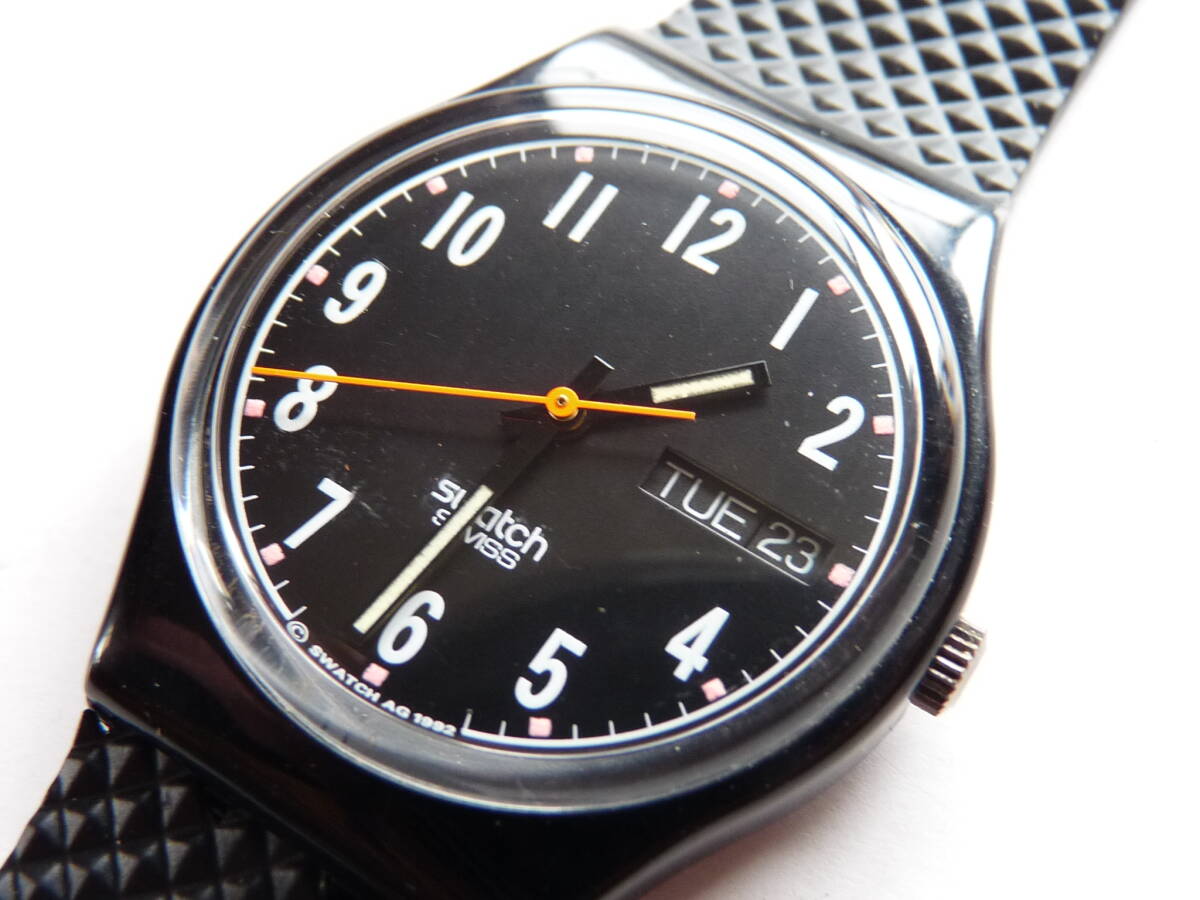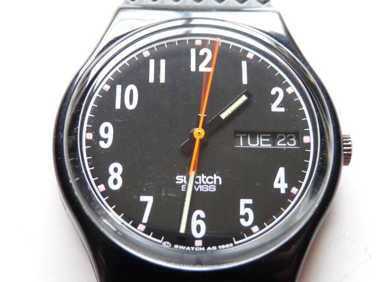 未使用電池交換済 スウォッチ レギュラーモデル Swatch 1993年モデル TEE 品番GB728 3時方向にデイト/曜日表示 ベルト取替済