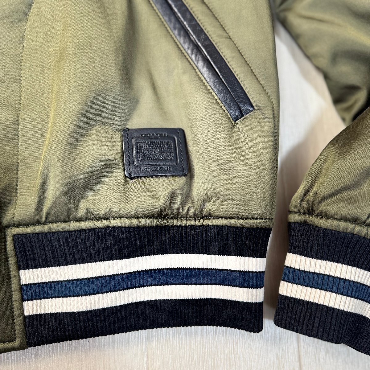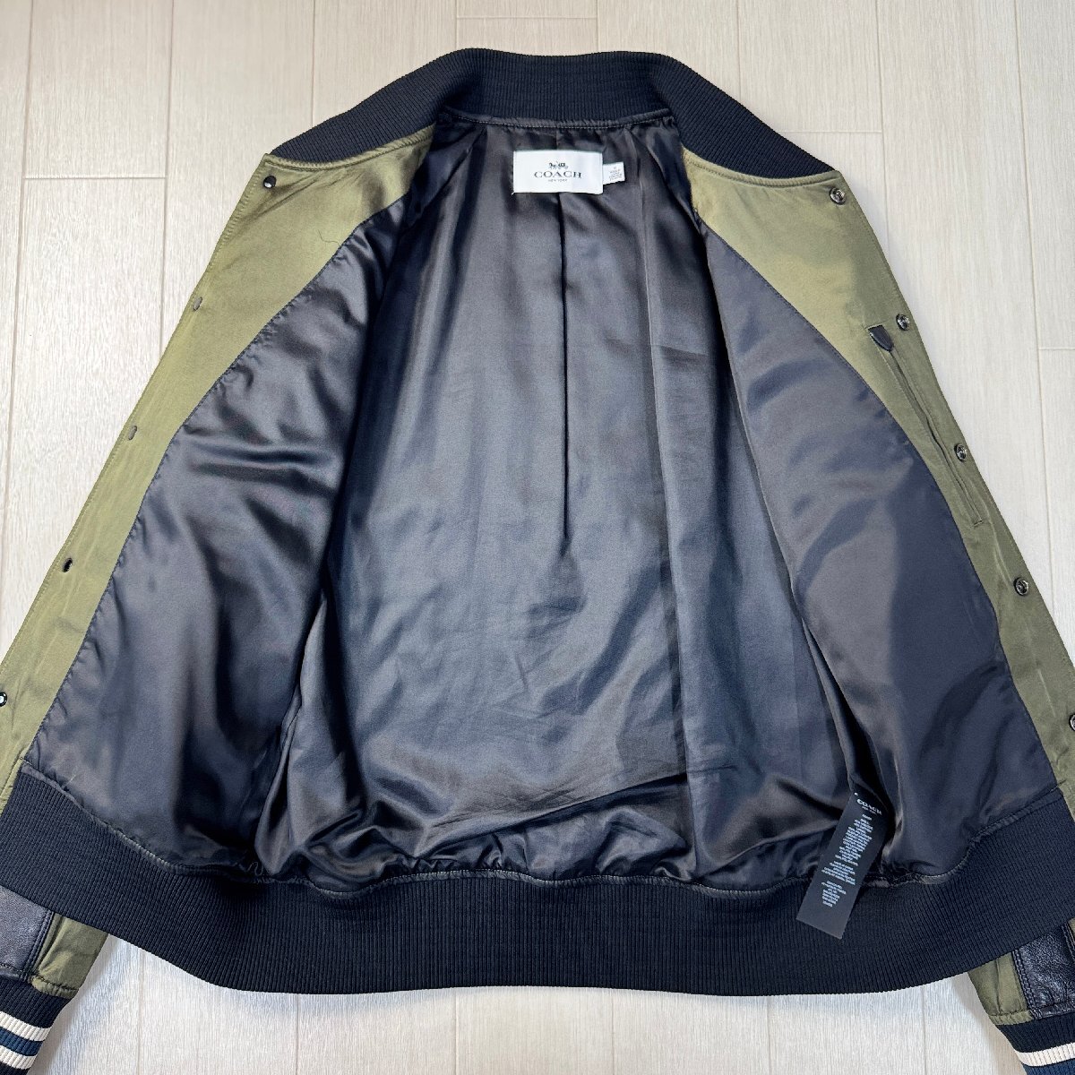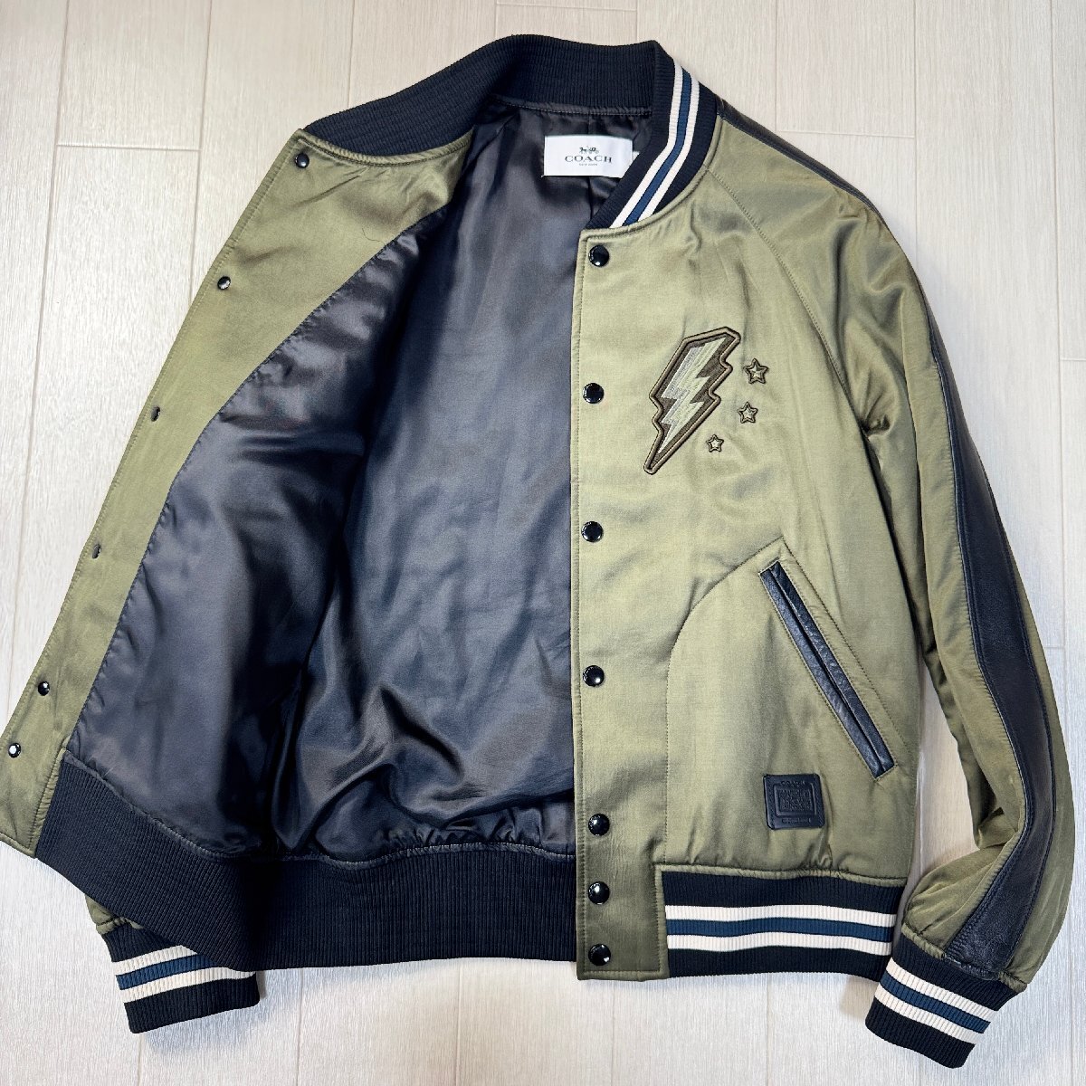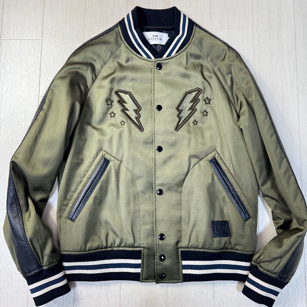 美品/M-L相当★コーチ/COACH 袖レザー 羊革 スタジャン 光沢生地 スカジャン ジャケット ロゴワッペン 稲妻刺繍 異素材切替 メンズ カーキ