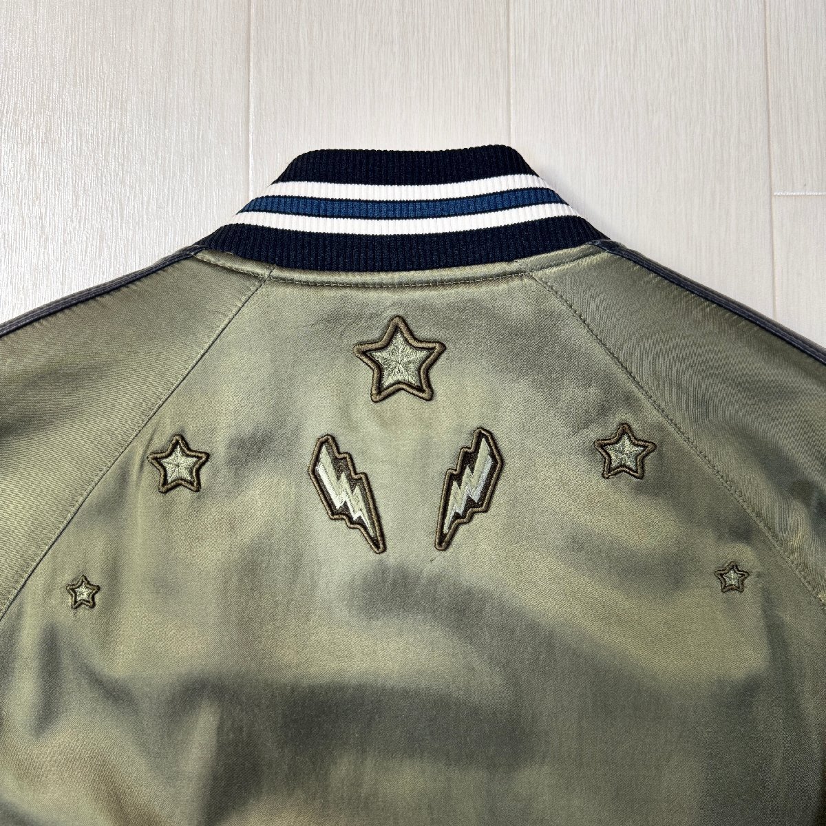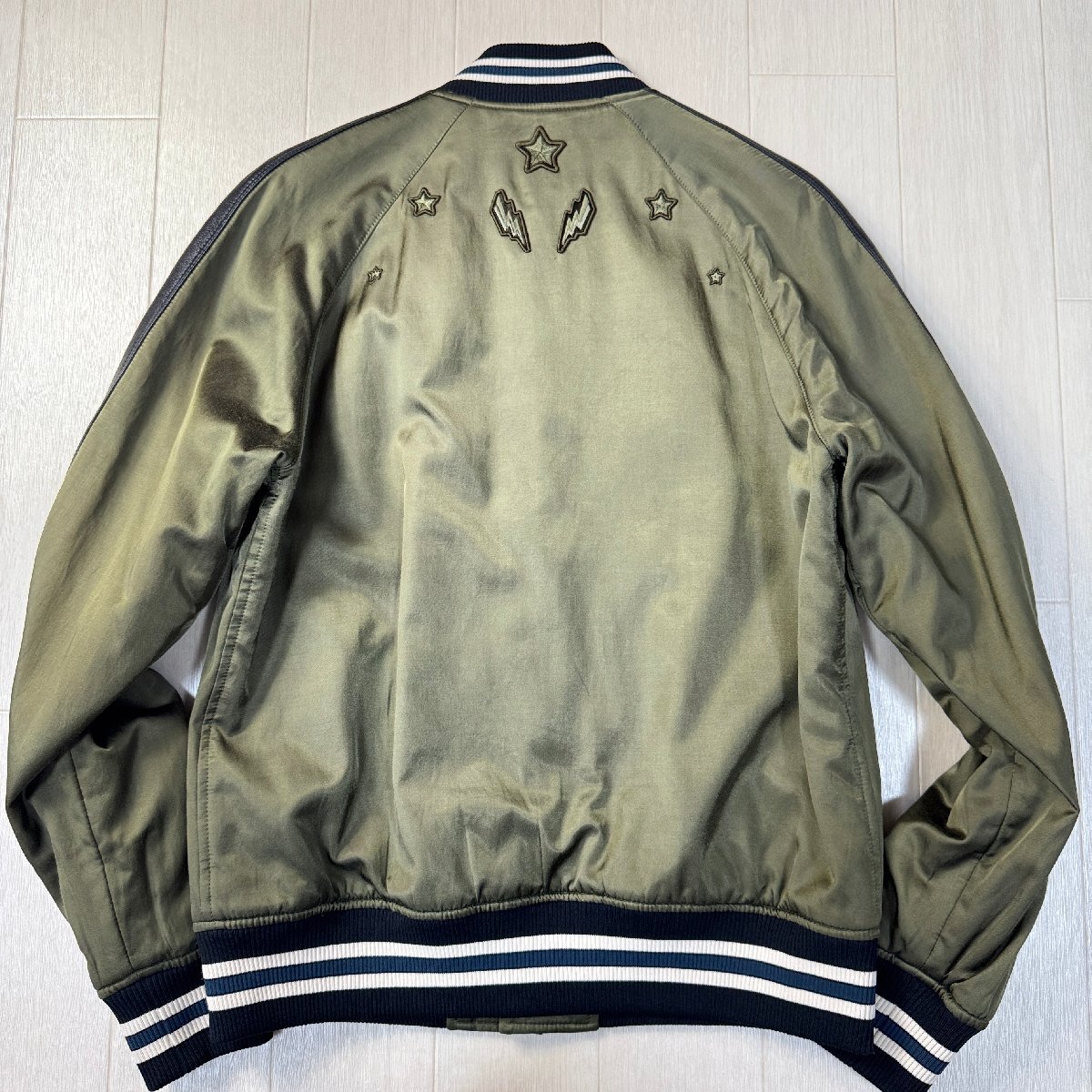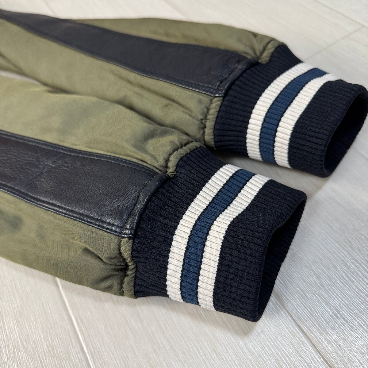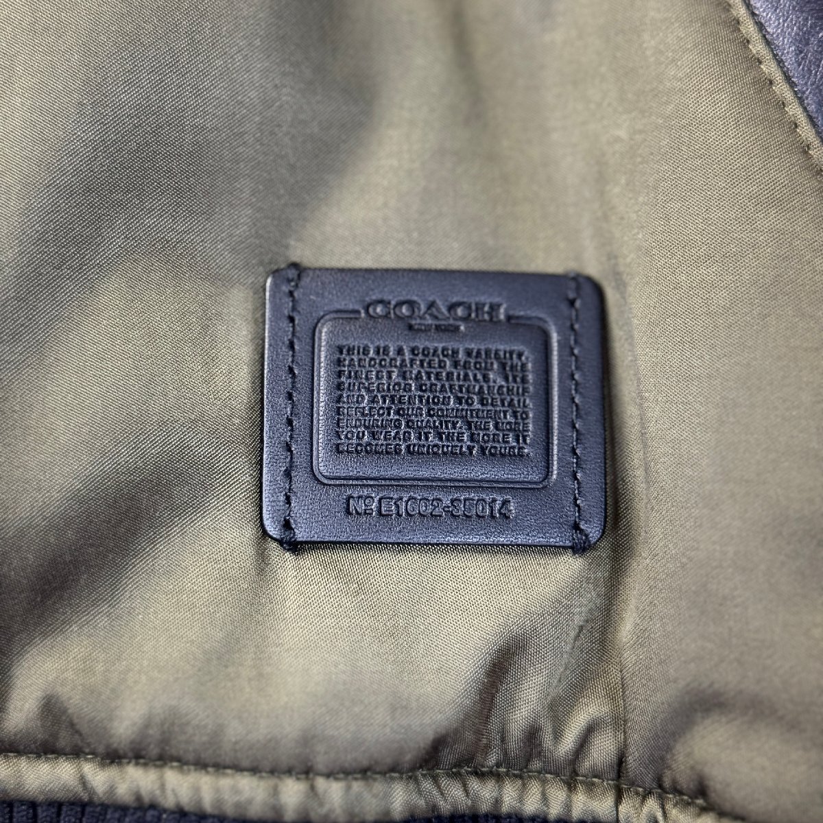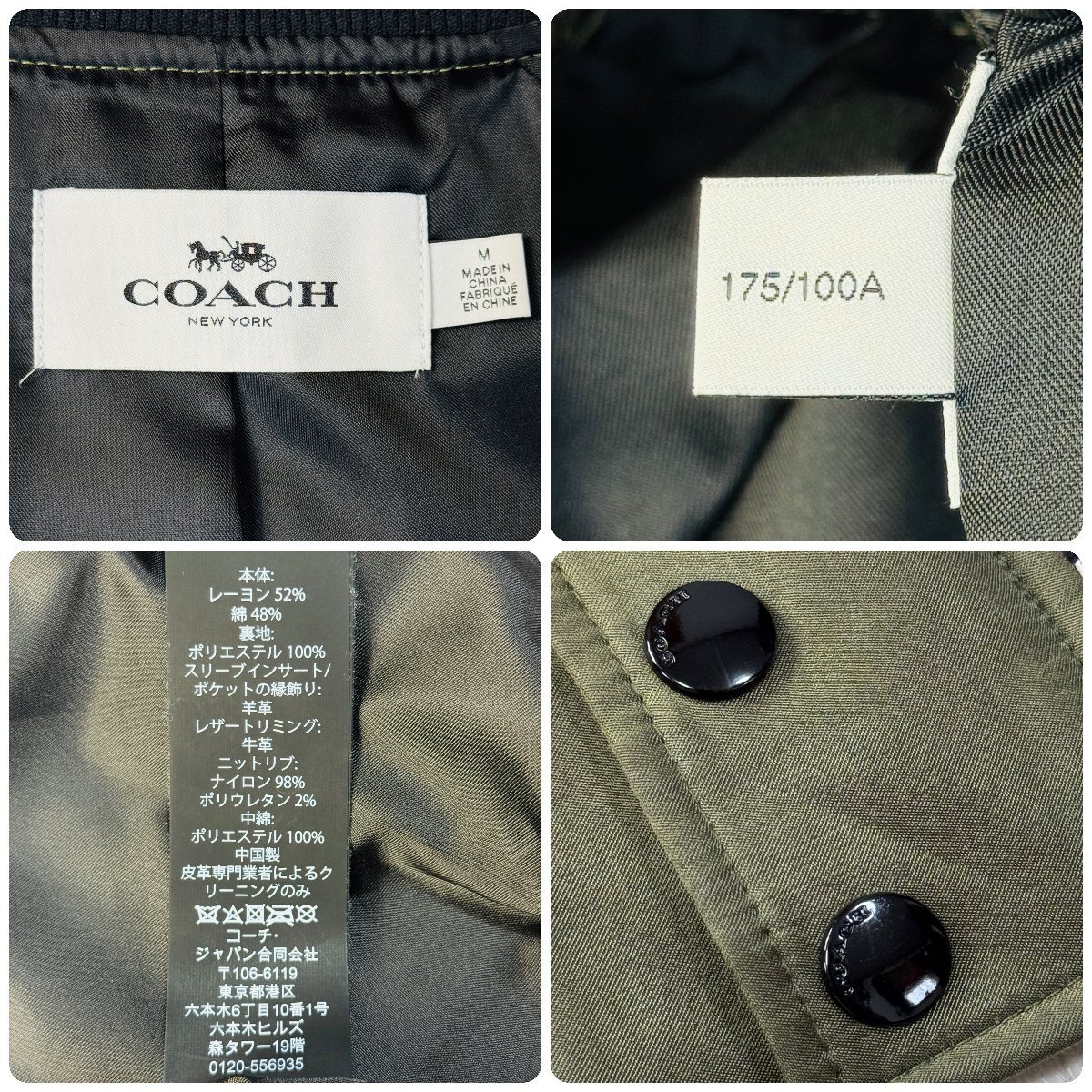 美品/M-L相当★コーチ/COACH 袖レザー 羊革 スタジャン 光沢生地 スカジャン ジャケット ロゴワッペン 稲妻刺繍 異素材切替 メンズ カーキ