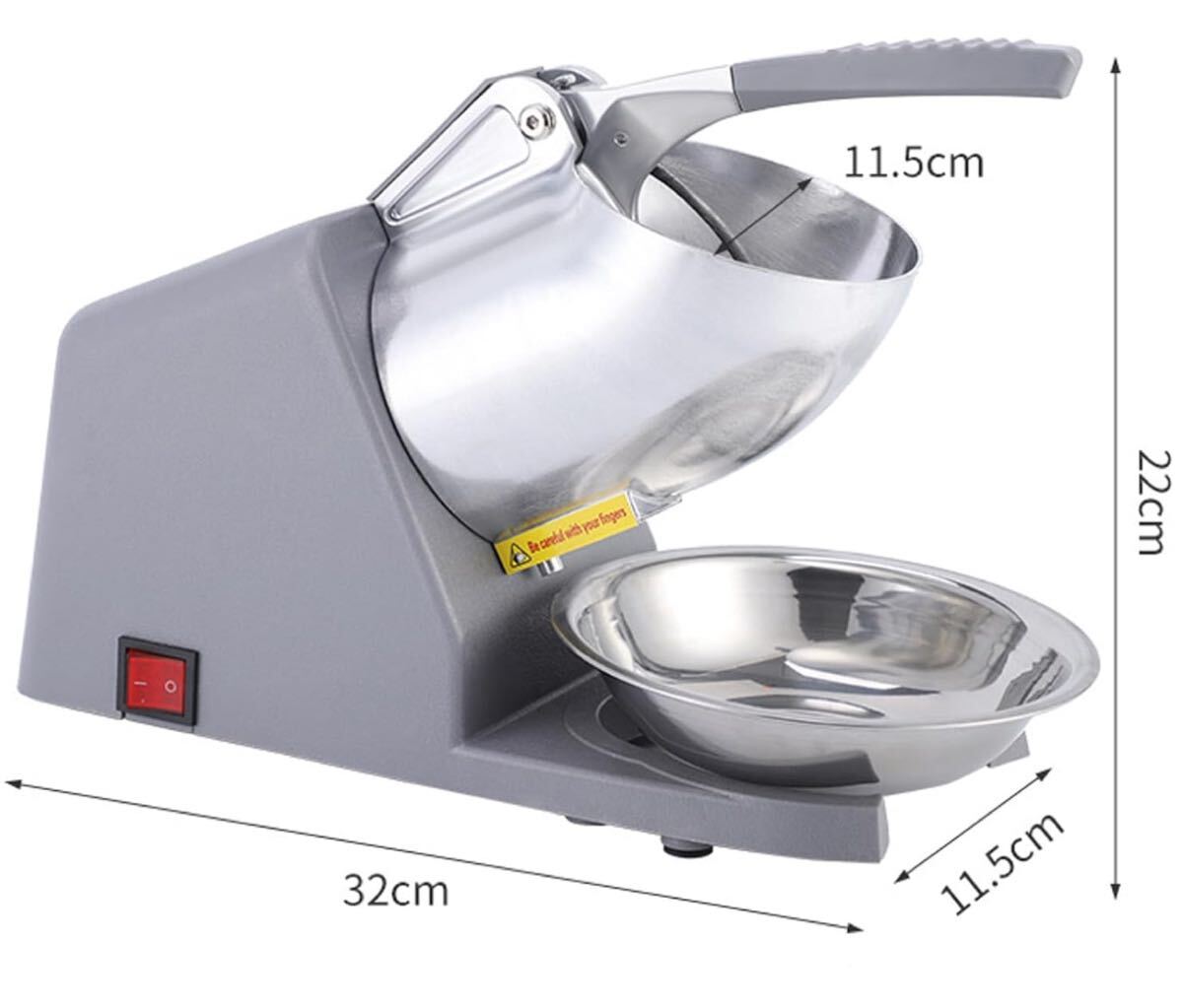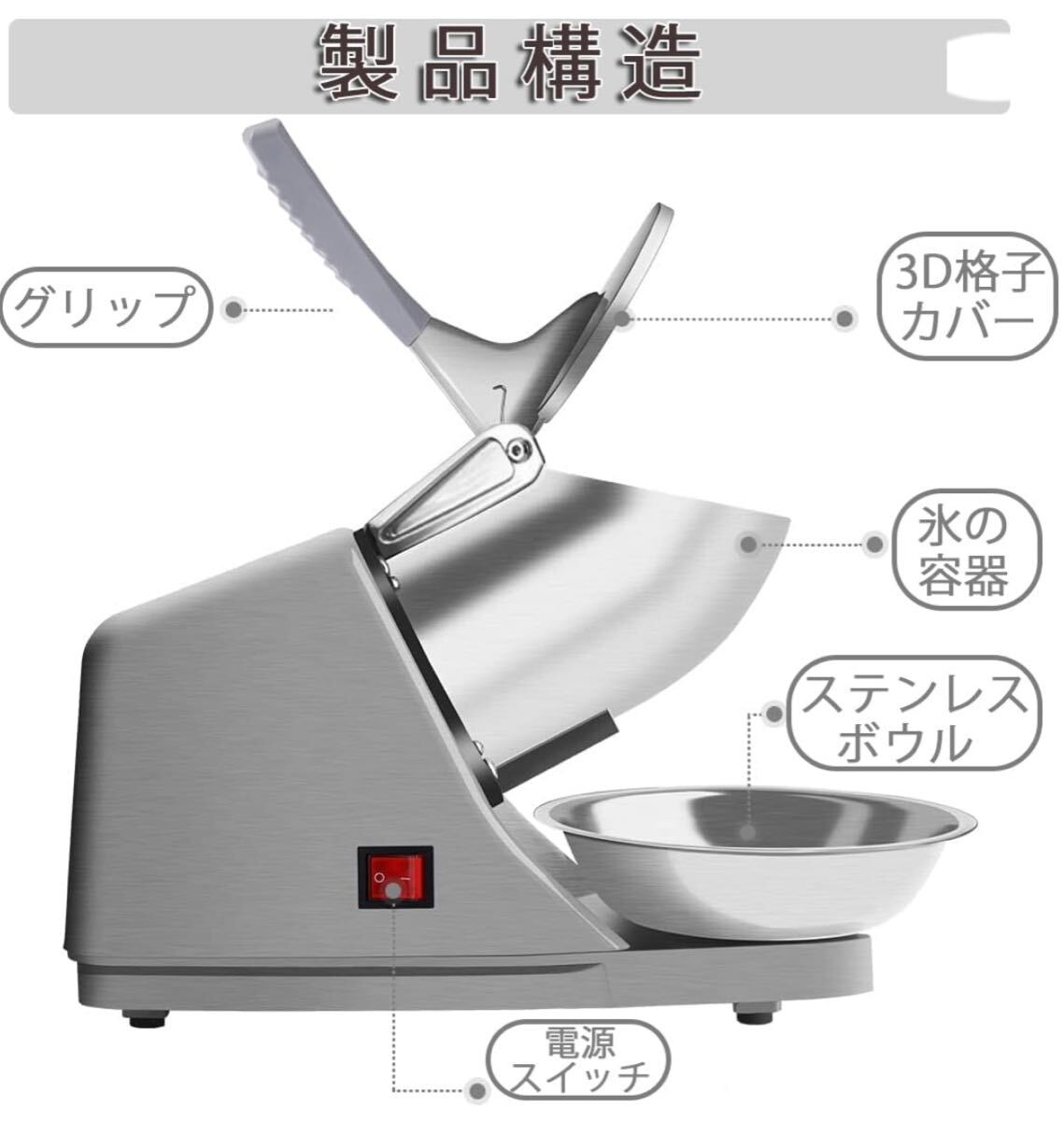 「操作簡単」かき氷を入れるボウルを台に置き、角氷を氷の樽に入れる。片手でハンドルを押して角氷を前方に押します。かき氷が氷の出口から出てきて、ボウルに到着します。