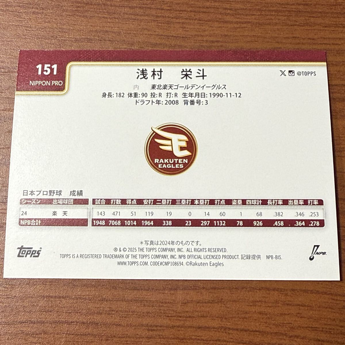 Topps 2025 NPB 東北楽天ゴールデンイーグルス 浅村栄斗 ベースカード 151