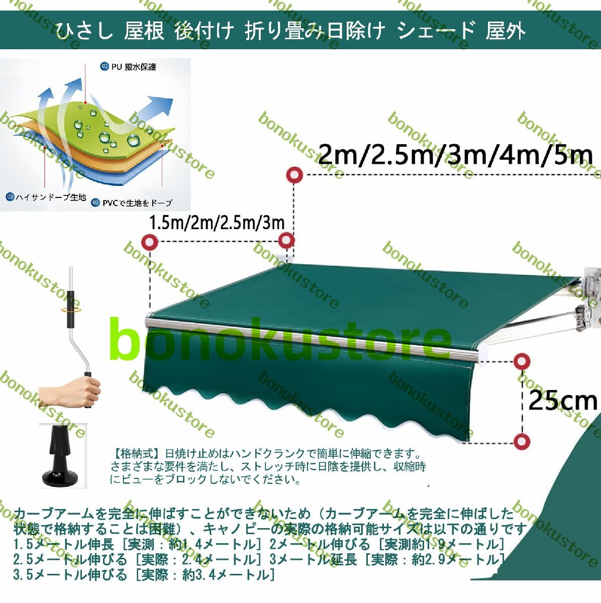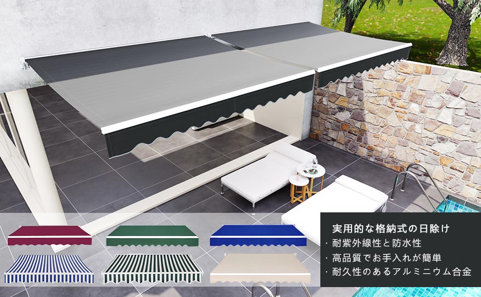 【パティオオーニング手動格納式】手動格納式を使用すると、日よけを適切な幅に調整できます。使用する必要がない場合は 収納することができ 壁から降ろす必要はありません さまざまな表面:当社のサンシェードは 羽目板やスタッコなどのさまざまな表面に取り付けることができます。コンクリート表面に取り付けるためのすべてのハードウェアが含まれています。木造住宅用の取り付けネジは含まれていません。