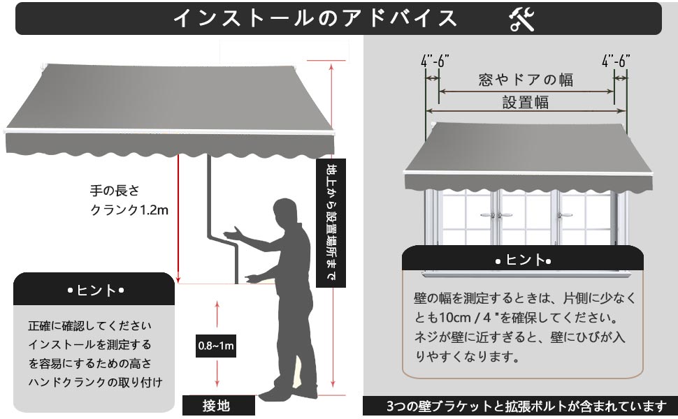 【パティオオーニング手動格納式】手動格納式を使用すると、日よけを適切な幅に調整できます。使用する必要がない場合は 収納することができ 壁から降ろす必要はありません さまざまな表面:当社のサンシェードは 羽目板やスタッコなどのさまざまな表面に取り付けることができます。コンクリート表面に取り付けるためのすべてのハードウェアが含まれています。木造住宅用の取り付けネジは含まれていません。