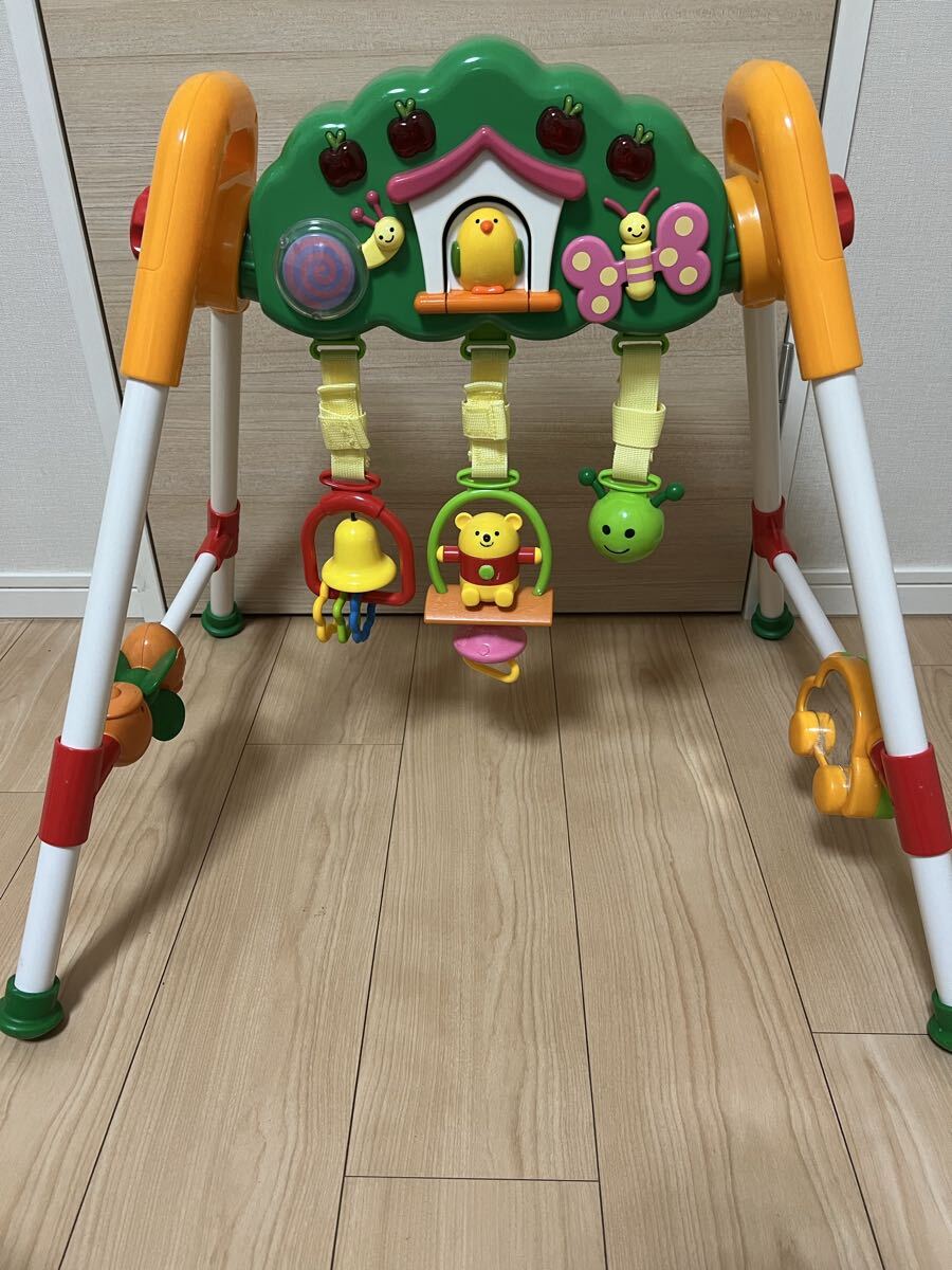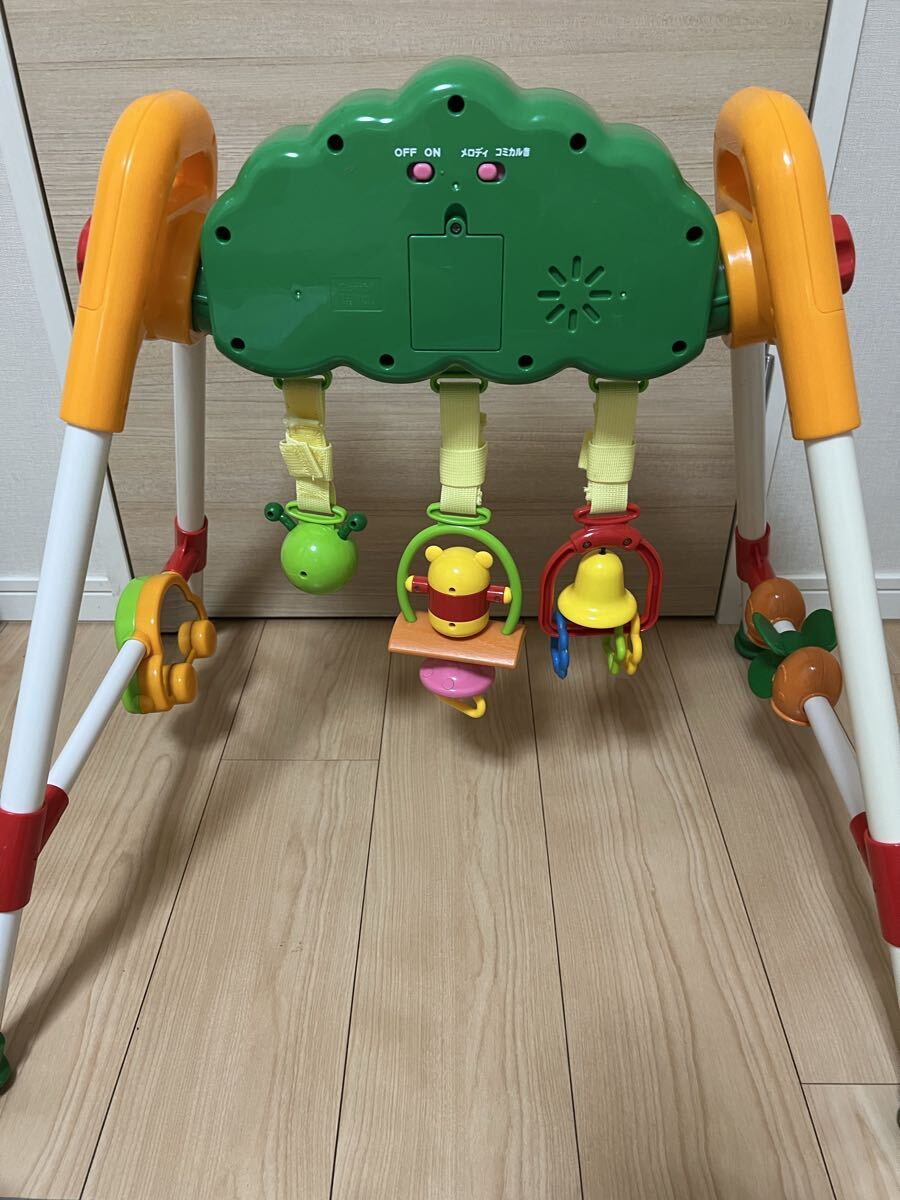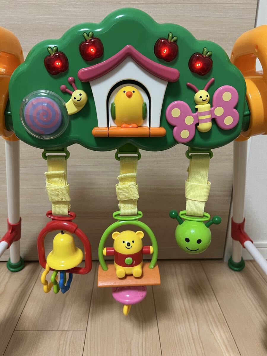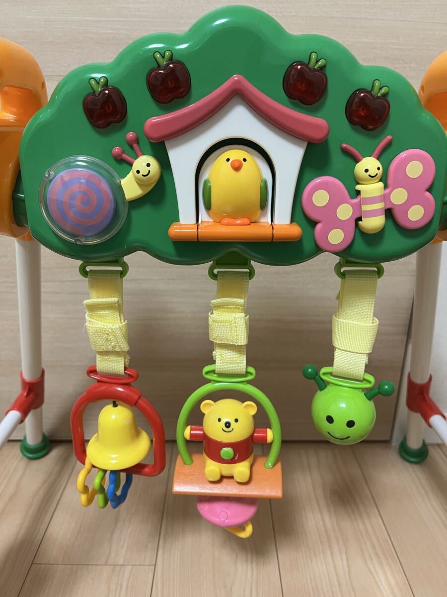 音と光、動物たちがかわいらしくアクションする楽しいジム。レバーを引っ張ると赤ちゃんの大好きなメロディと光がスタートし、動物たちがアクションします。ベルトの長さが調節できるので、おすわりの頃まで楽しく長く遊べます。