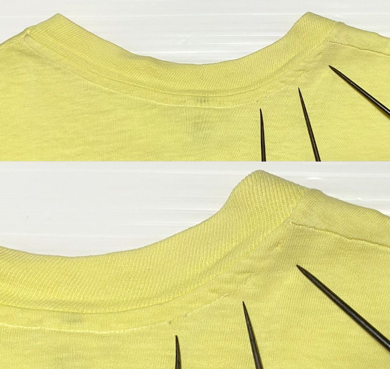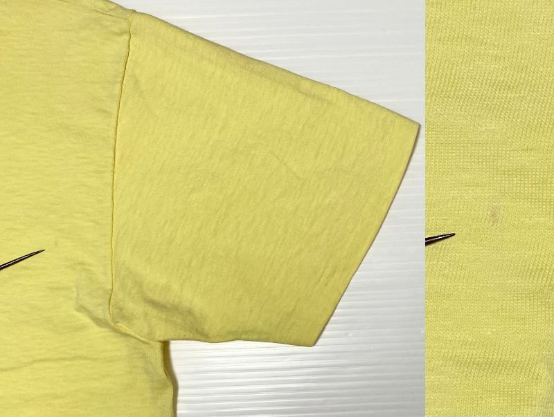 ■状態 :畳んだ状態で保管しておりますのでシワがございます。全体的に色ムラがございます(紫色っぽくなっています)。数か所の穴(画像7~8)。シミ(画像6、9)。背面ネックにステッチ抜け(画像10)。シワ、畳みジワ、色褪せ、色ムラ、色落ち、黄ばみ、ヤケ、シミ、多少の汚れ、キズ、スレ、毛羽立ち、毛玉、縮み、型崩れ、プリントのひび割れ等の使用感、経年感がございます。見落としはご容赦くださいませ。