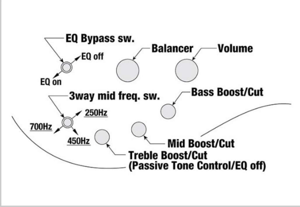 ・equaliser Ibanez Custom Electronics 3-band EQ w/ EQ bypass switch (passive tone control on treble pot) & 3-way Mid frequency switch