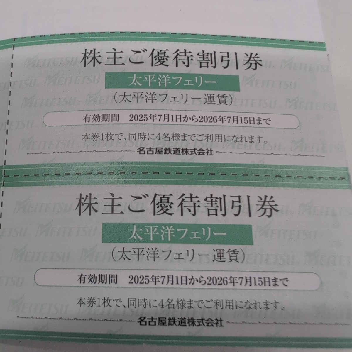 名鉄グループ優待券の太平洋フェリーA料金(通常期)運賃10%割引券1枚になります。2026年7月15日までご利用出来ます。本券1枚で4名様まで割引します。必ず050-3535-1163(予約センター)にて電話予約の上、ご利用ください。希望者には最大6枚まで無料で増量サービスします。クレカ決済など希望の方は質問ください。別途ご案内します。100円になりますが、コンビニ手数料330円は不要でクレカなど決済出来ます。