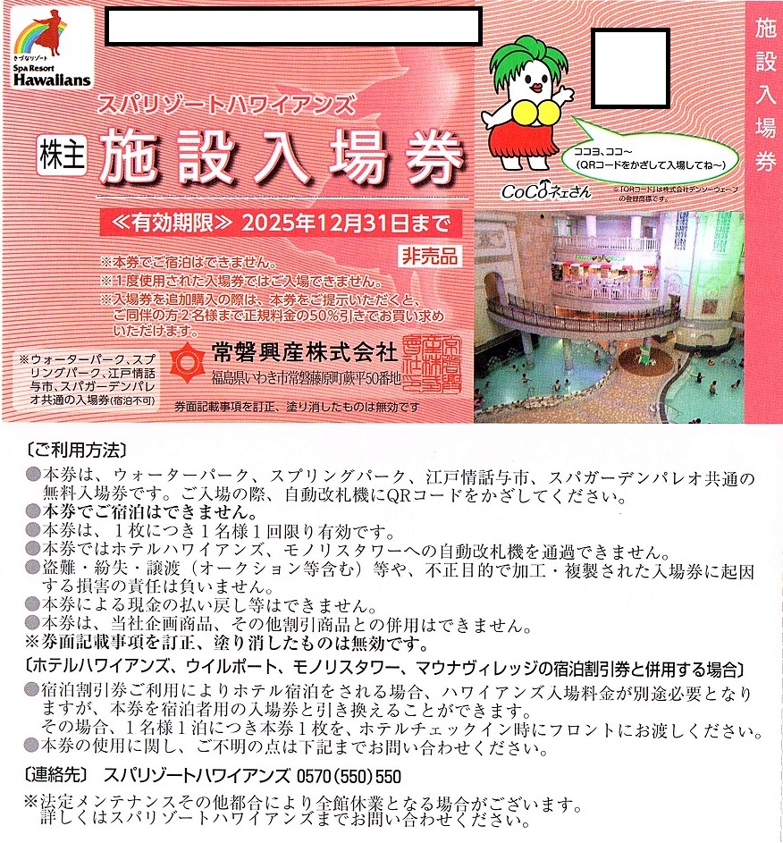 常磐興産 株主優待券 スパリゾートハワイアンズ 入場券 1枚(単位)~9枚迄 2025年12月末迄有効