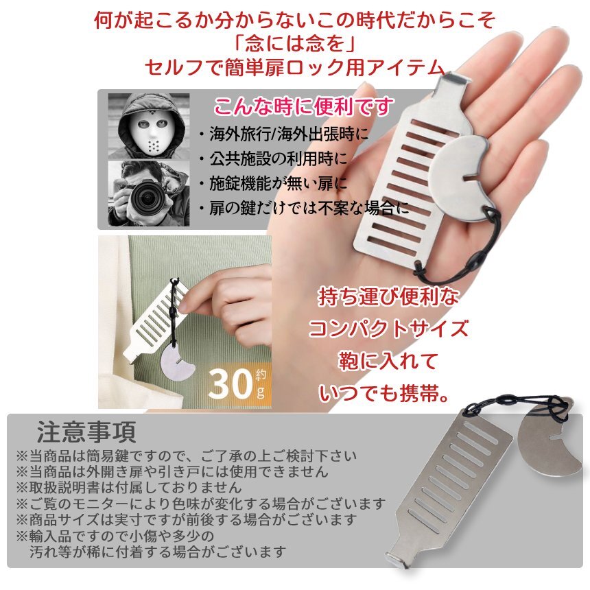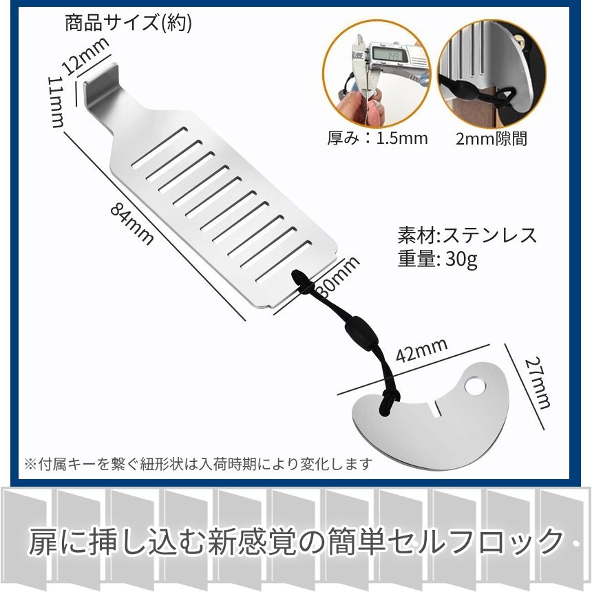 送料無料!!! 送料及び下記のご案内をご確認の上、ご入札お願い致します。 \全国送料無料♪/ (ご注文個数により変更される場合がございます) ※画像内にカラー及びサイズ等の選択が可能と記載がある場合がございますが、 お届けする物はタイトルまたは商品説明文に記載の物です。 ※注文後のカラー変更や異なるカラー・サイズ指定等は一切承っておりません。 ※※仕様(ロゴデザイン/ロゴ有無等も含む)は予告なく変更する場合があります。 ※多少の汚れや小傷がある場合がございますがご了承ください。 梱包は簡易包装ですので、箱の角落ち等はご了承願います。 【商品説明】 「トイレの扉鍵が心もとない…」 「海外の宿泊でチェーンロックが無い…」 「共用施設のドア鍵だけじゃ心配…」 こんな悩みを一発解決。 2ステップで簡単取付け♪持ち運ぶ「扉セルフロック」新登場。 \SELRO セルロ/ 内扉にセルフで施錠するステンレスアクセサリーです。 薄型&強靭ステンレス素材使用 アウトドアシーンや海外旅行にも活躍する便利なアイテム。 ========= 【商品仕様】 パッケージ内容:SELRO本体×1 付属キー×1 カラー:ステンレスシルバー ※内開き用のアイテムですので外開き扉や引き戸には非対応です ※扉のくぼみ形状により取付けが難しい場合がございます ※日本語説明書は付属しておりません。 ※商品サイズは実寸ですが前後する場合がございます。 ※輸入品ですので多少の臭いやスレ傷、汚れはご了承ください。 ========= ※詳細は画像にてご確認ください ![]() ![]() ![]() ![]() ![]() ![]() ![]() |