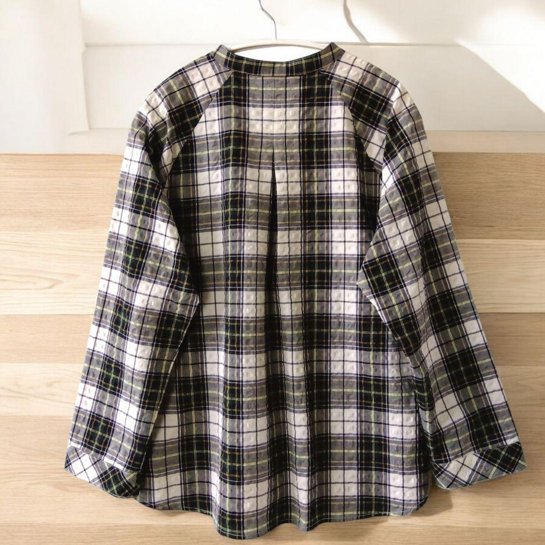 シンプルなバンドカラーのデザインが首元をすっきりと見せ、ふんわりゆったりとしたシルエットで涼しく、優し気な表情に。