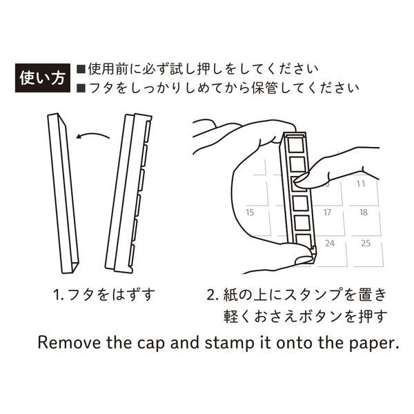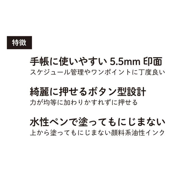 目の前にボタンがあるとなぜか押したくなってしまう…そんな魅力のあるボタンとスタンプが一緒になりました。※本体が平たく安定しているので、ブレにくく押しやすい!※ペンケースに入れても場所を取らない!フタを外して押したい場所の上に乗せてスタンプを押すと捺印できます。捺印回数は約1,000回・使い切りタイプです。パッケージサイズW65×D120×H18mm本体サイズ(フタを含む)W15×D77×H14mm