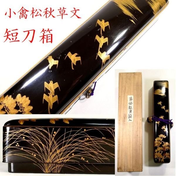 | 商品説明 | ~寸法~ 全長 約 38.5cm 横幅 約 7.0cm 高さ 約 6.5cm 黒漆に栄える 小禽松秋草文の金蒔絵が美しい 見栄え良き一品です。 「短刀箱」と書かれておりますが 文箱かもしれません。 いずれにしましても蒔絵の華やかな作品です。 この機会に是非手に入れて下さい。 保管箱がございます。 ~状態~ 状態は画像の通りとなります。 本体に修繕箇所がございます。 また、経年による多少の小傷くらいはございますが 大きく鑑賞を損なう事はないと思われます。 画像にてご確認下さい。 許容範囲内の時代傷みはご理解下さい。 |
