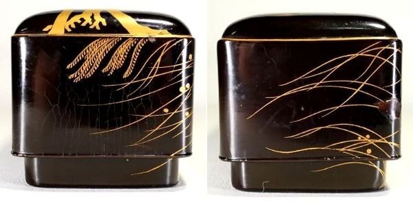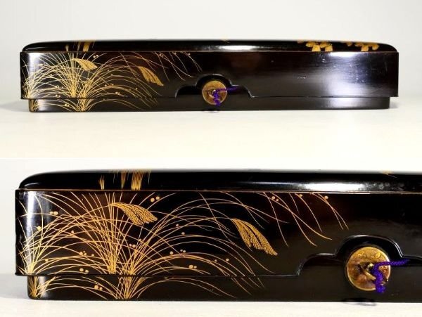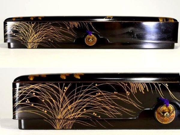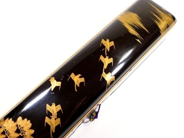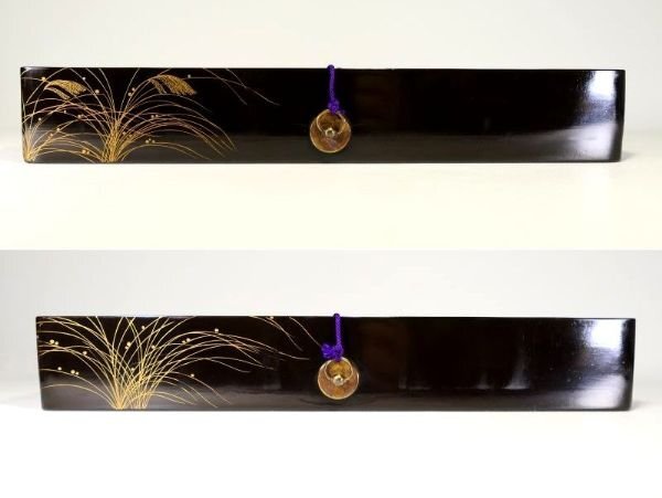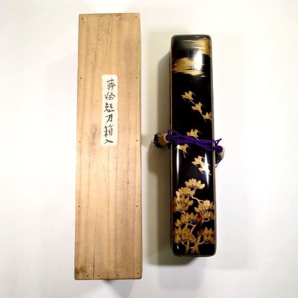 | 商品説明 | ~寸法~ 全長 約 38.5cm 横幅 約 7.0cm 高さ 約 6.5cm 黒漆に栄える 小禽松秋草文の金蒔絵が美しい 見栄え良き一品です。 「短刀箱」と書かれておりますが 文箱かもしれません。 いずれにしましても蒔絵の華やかな作品です。 この機会に是非手に入れて下さい。 保管箱がございます。 ~状態~ 状態は画像の通りとなります。 本体に修繕箇所がございます。 また、経年による多少の小傷くらいはございますが 大きく鑑賞を損なう事はないと思われます。 画像にてご確認下さい。 許容範囲内の時代傷みはご理解下さい。 |