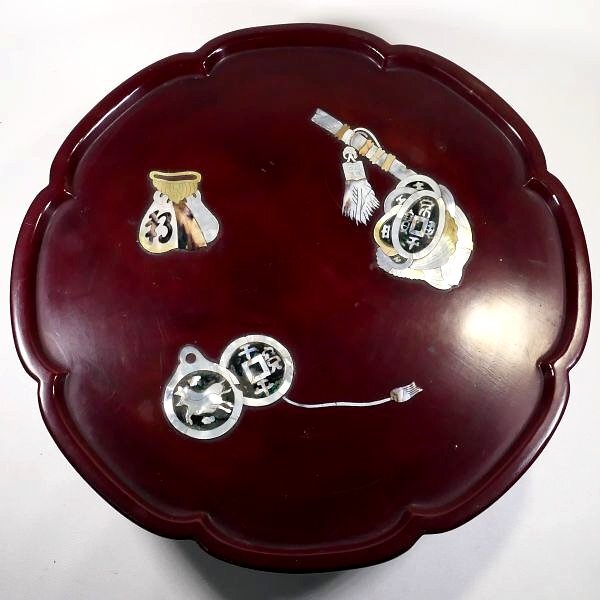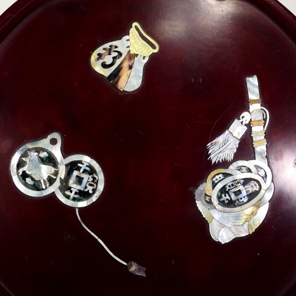 | 商品説明 | ~寸法~ 直径 約 45.0cm× 高さ 約 13.0cm 貨幣や袋の形の螺鈿細工が施された 飾り栄えのする一品です。 お部屋やお店のインテリアにいかがでしょうか。 大切にして頂ける方の元へ届けば幸いでございます。 ~状態~ 全体的に見て状態は概ね良好です。 多少の螺鈿の剥がれくらいはございますが 大きく鑑賞を損なうことは無いと思われます。 詳しくは画像にてご確認下さい。 その他、許容範囲内の時代傷みはご理解下さい。 |