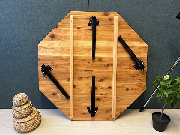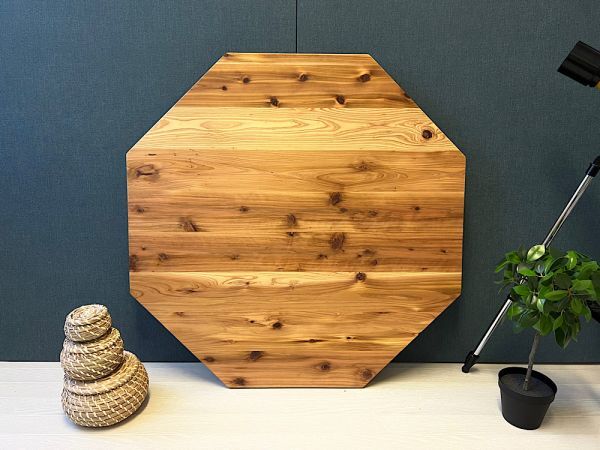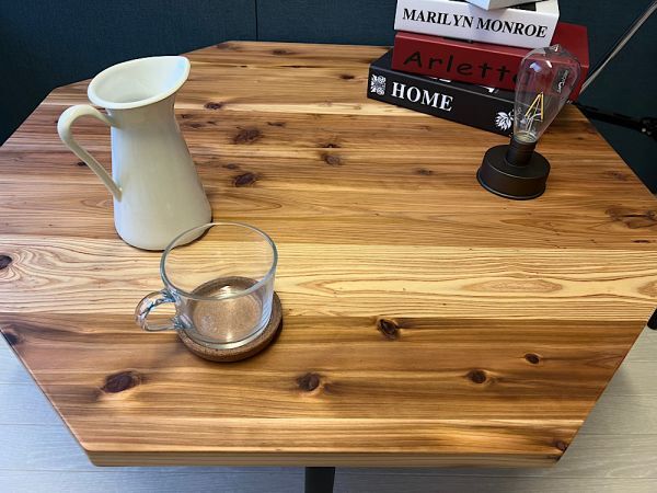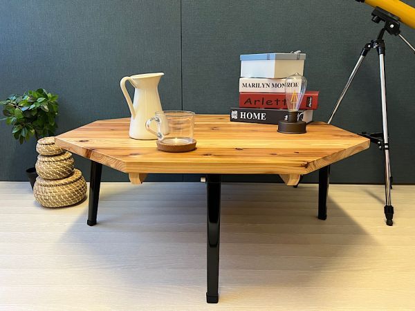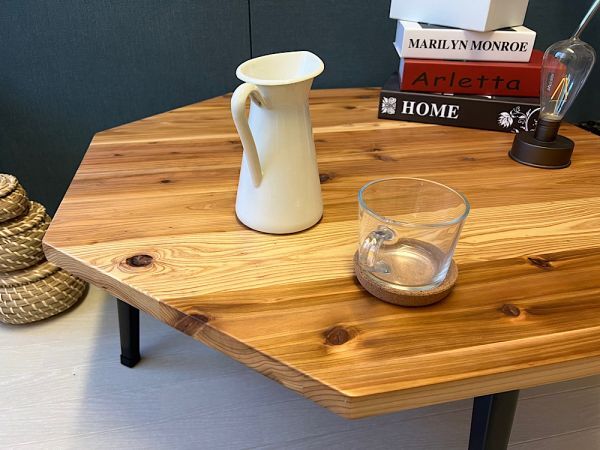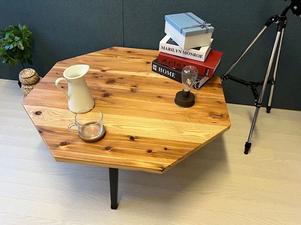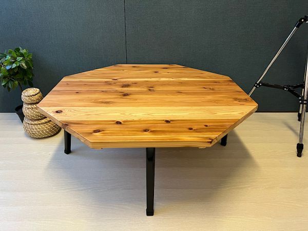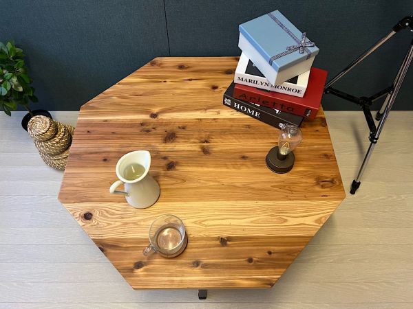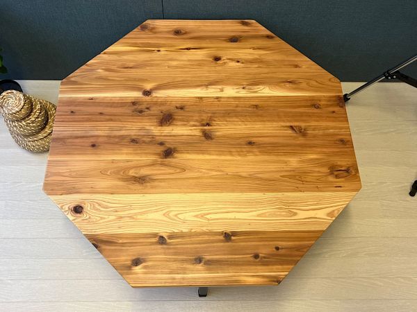 ◎荒々しい木目が特徴の、杉材を天板に使用した8角ローテーブルです。