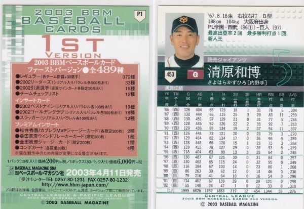●2003BBM 【清原 和博】 前期/プロモーション+後期:通常版 2種:巨人