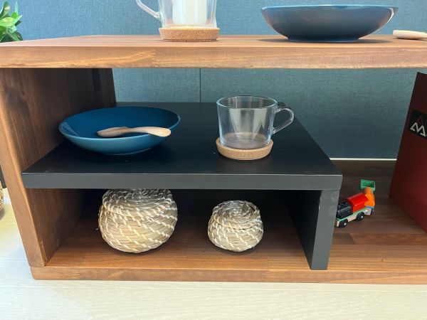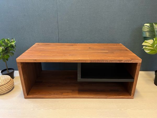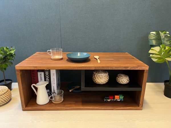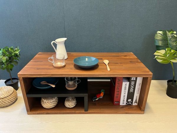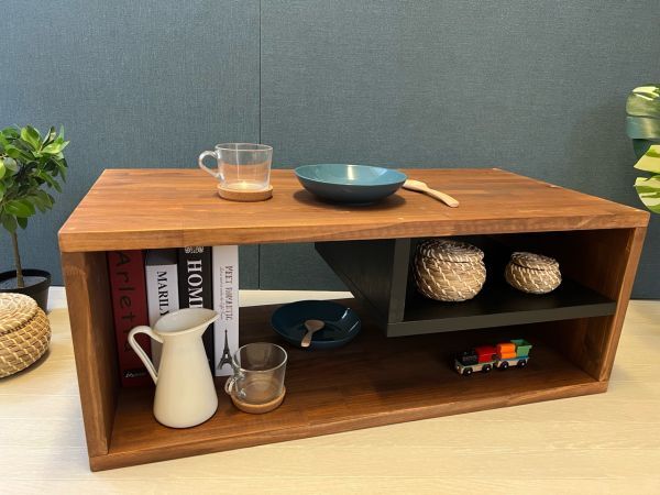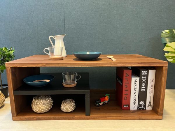 ◎ブラウン塗装したパイン材に、同じくブラック塗装をした収納スペースを組み入れたローテーブルです。