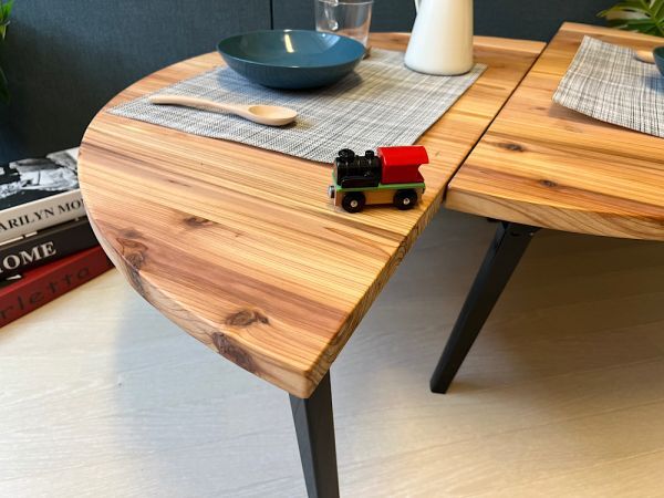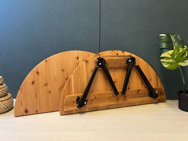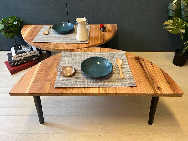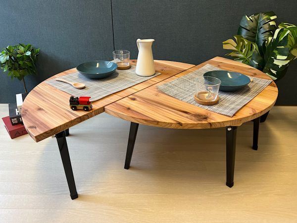 ◎丸形の天板を2分割し、それぞれ独立して使える様に脚を付けました。