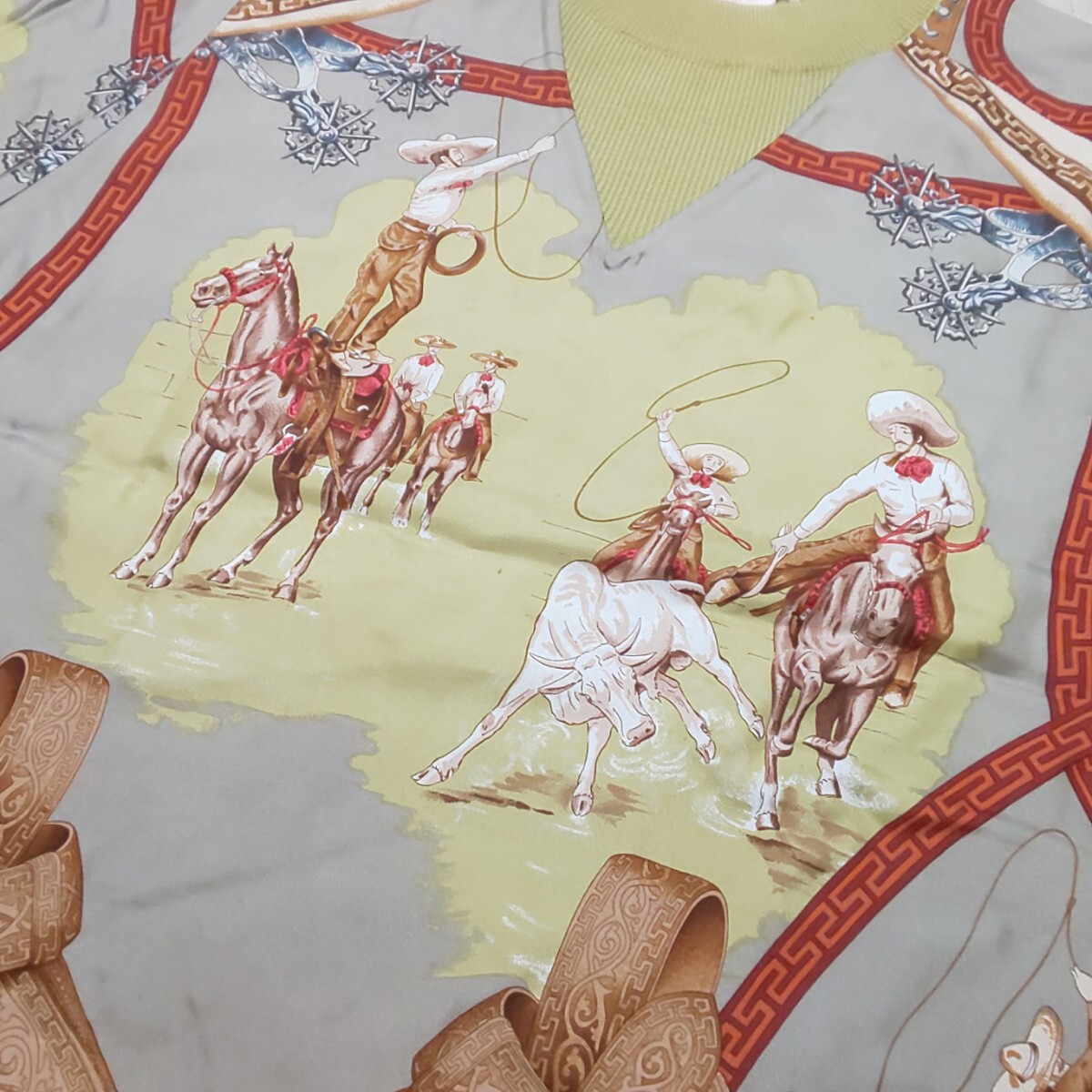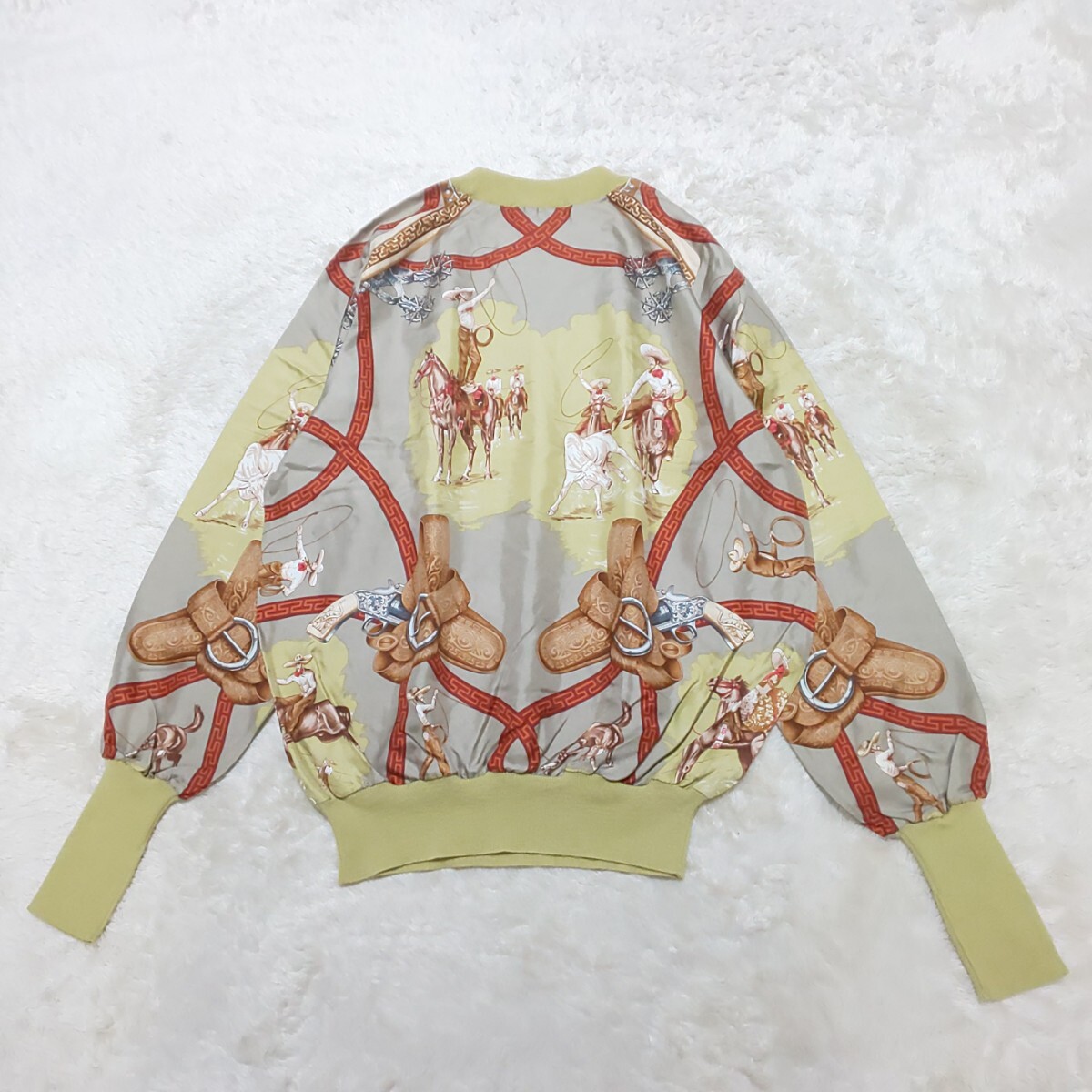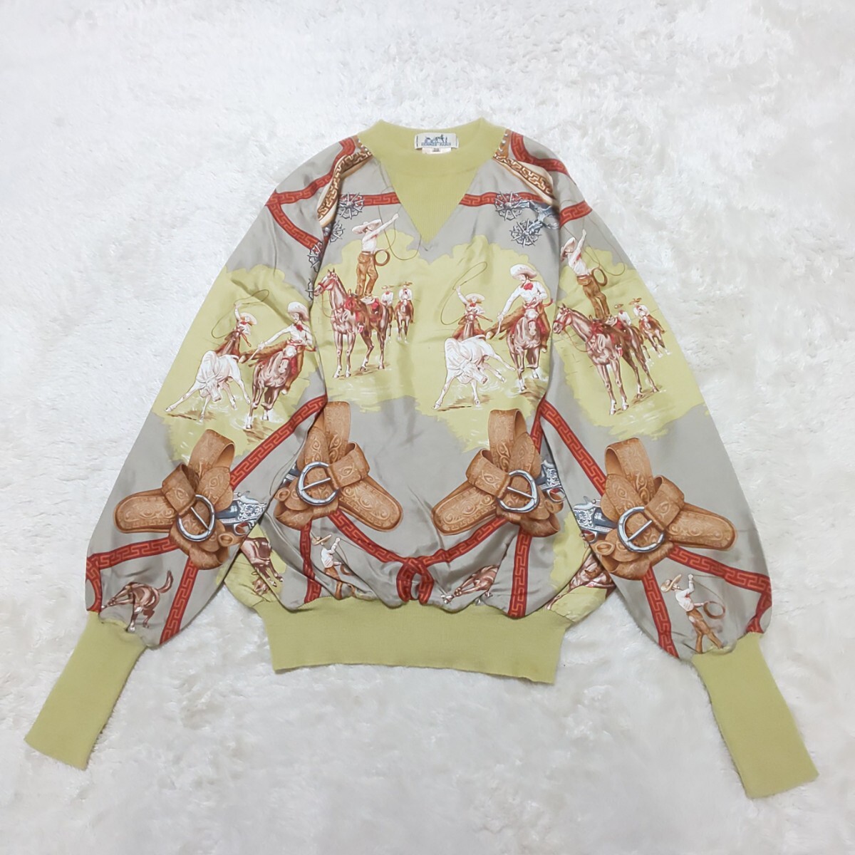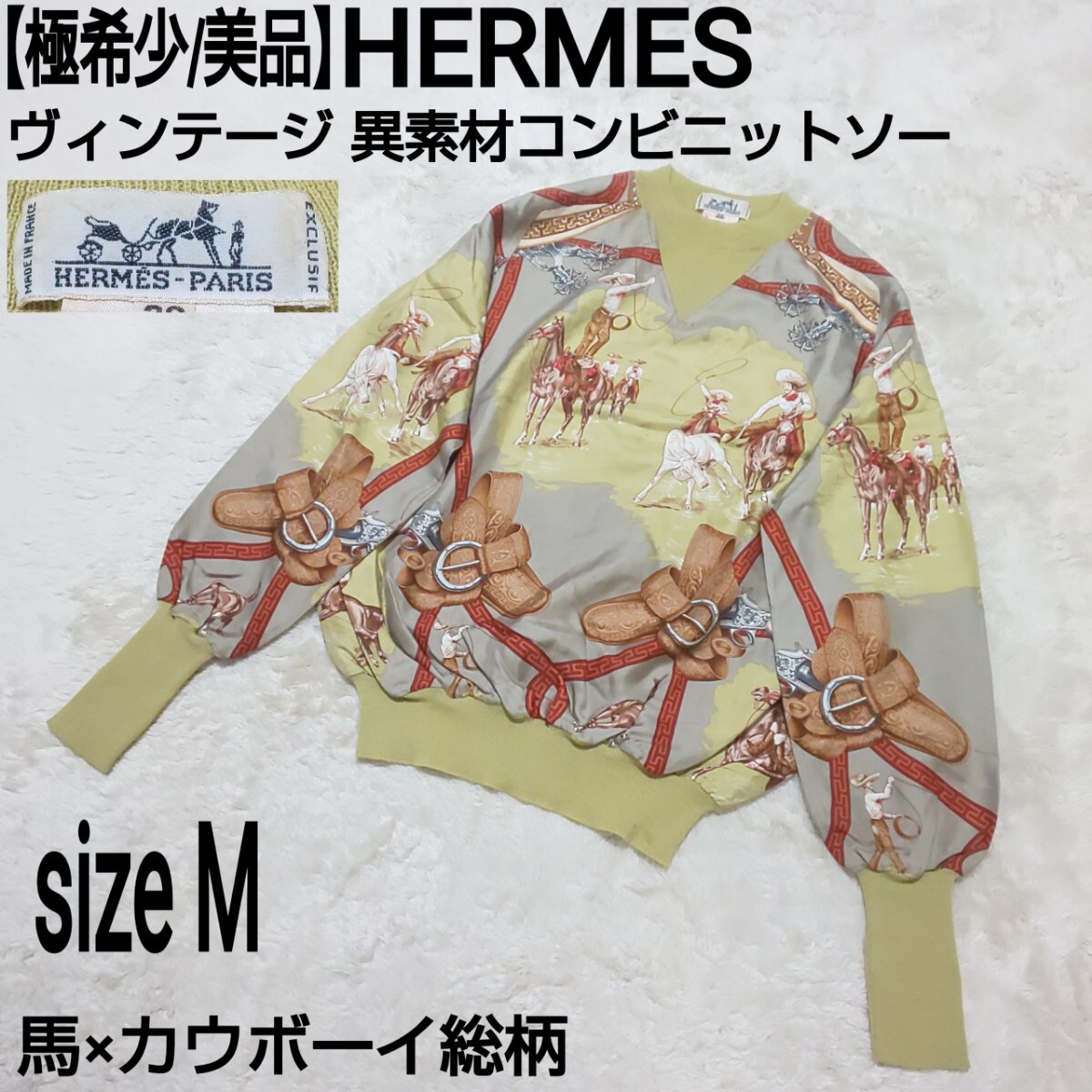 【極希少/美品】仏製 HERMES エルメス ヴィンテージ 異素材コンビニットソー セーター シルク総柄 馬 カウボーイ マルチカラー